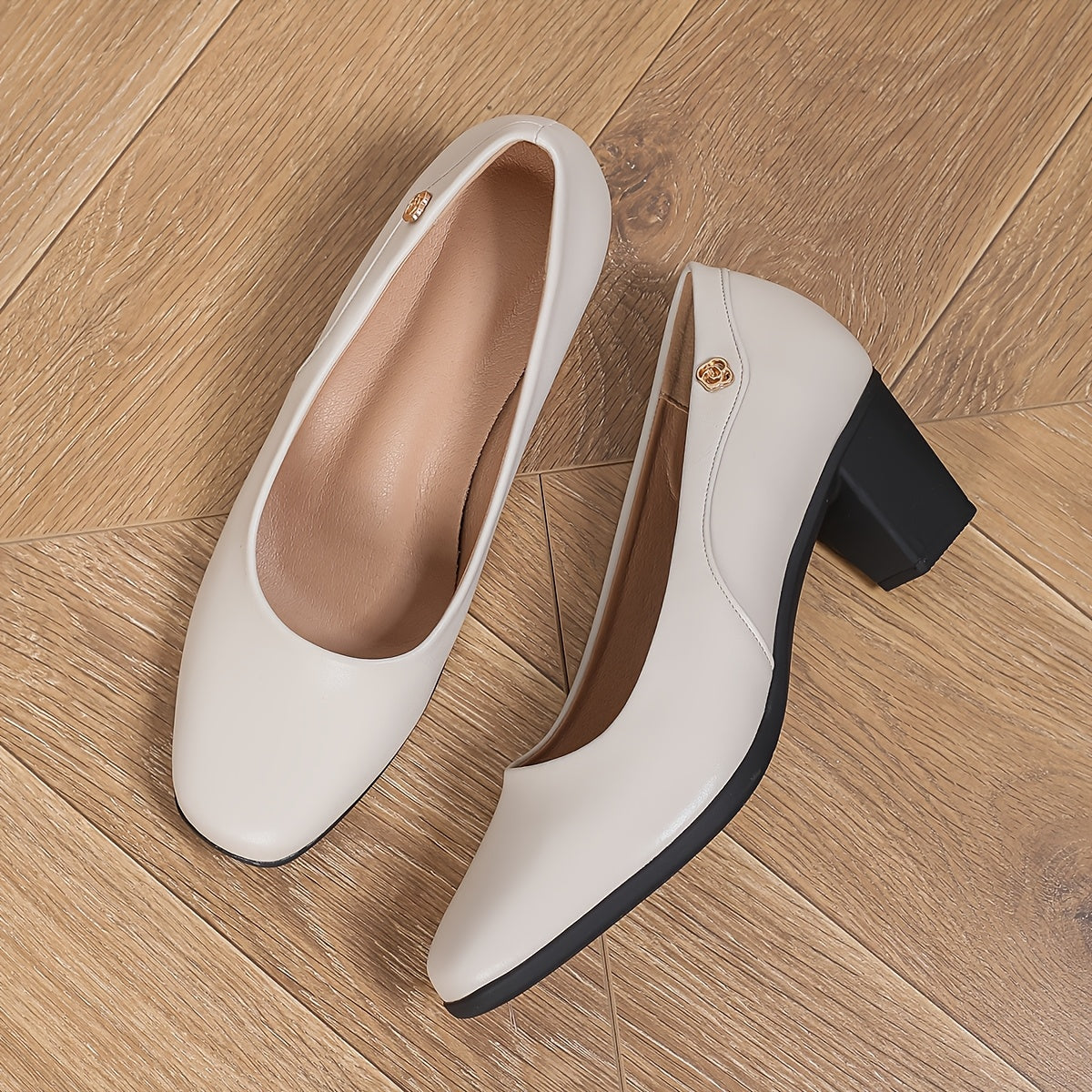 Women's Black Faux Leather Square Toe Pumps with Buckle, Mid-Chunky Heel