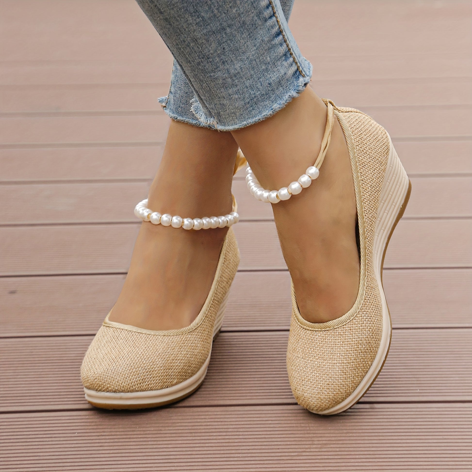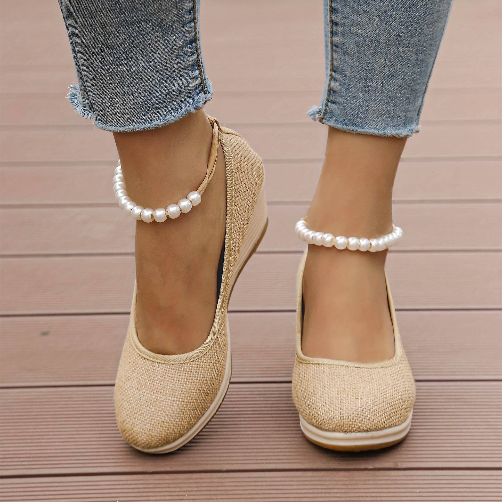 Women's Black Linen Wedge Heel Pumps Round-Toe Shoes with Ankle Bracelets