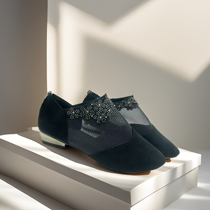Women's Black Mesh Pointed Toe Low Heel Sandals with Flower Zipper