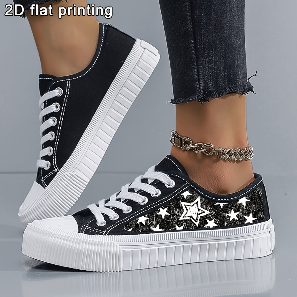 Women's Black White Star Print Casual Sneakers Low-Top Lace-Up Skate Shoes