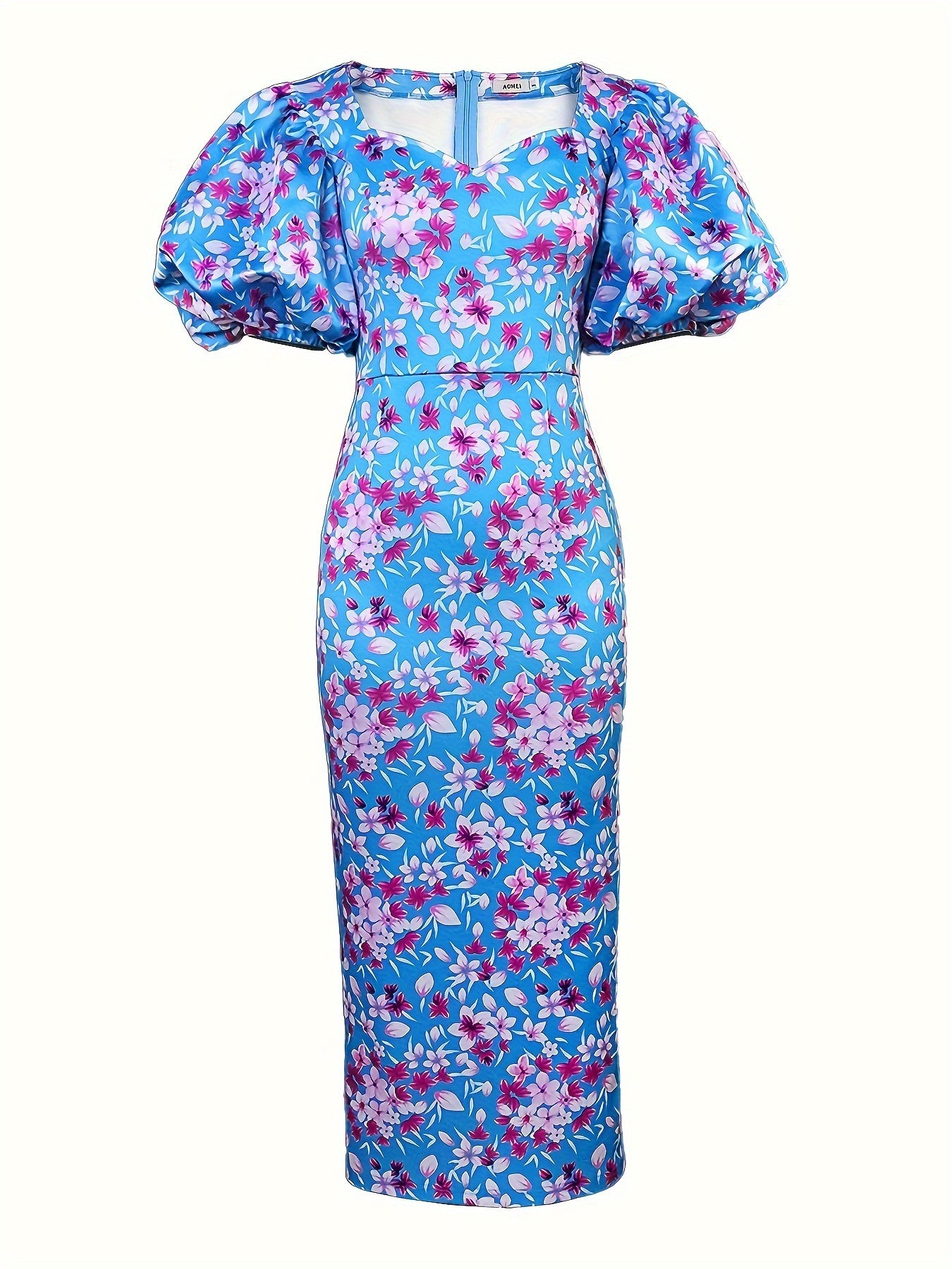 Women's Blue Floral Print Bodycon Dress with Puff Sleeves Square Neck