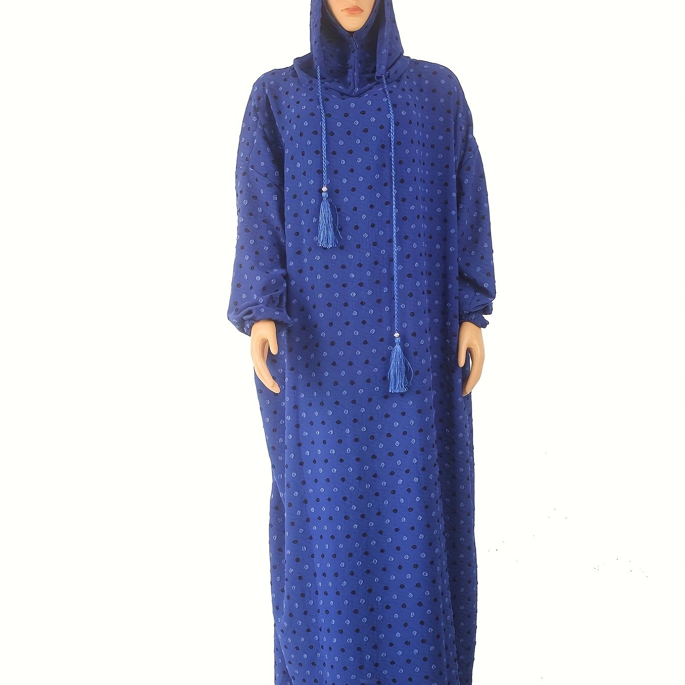 Women's Blue Polka Dot Abaya Kaftan Maxi Dress with Tassels and Lantern Sleeves