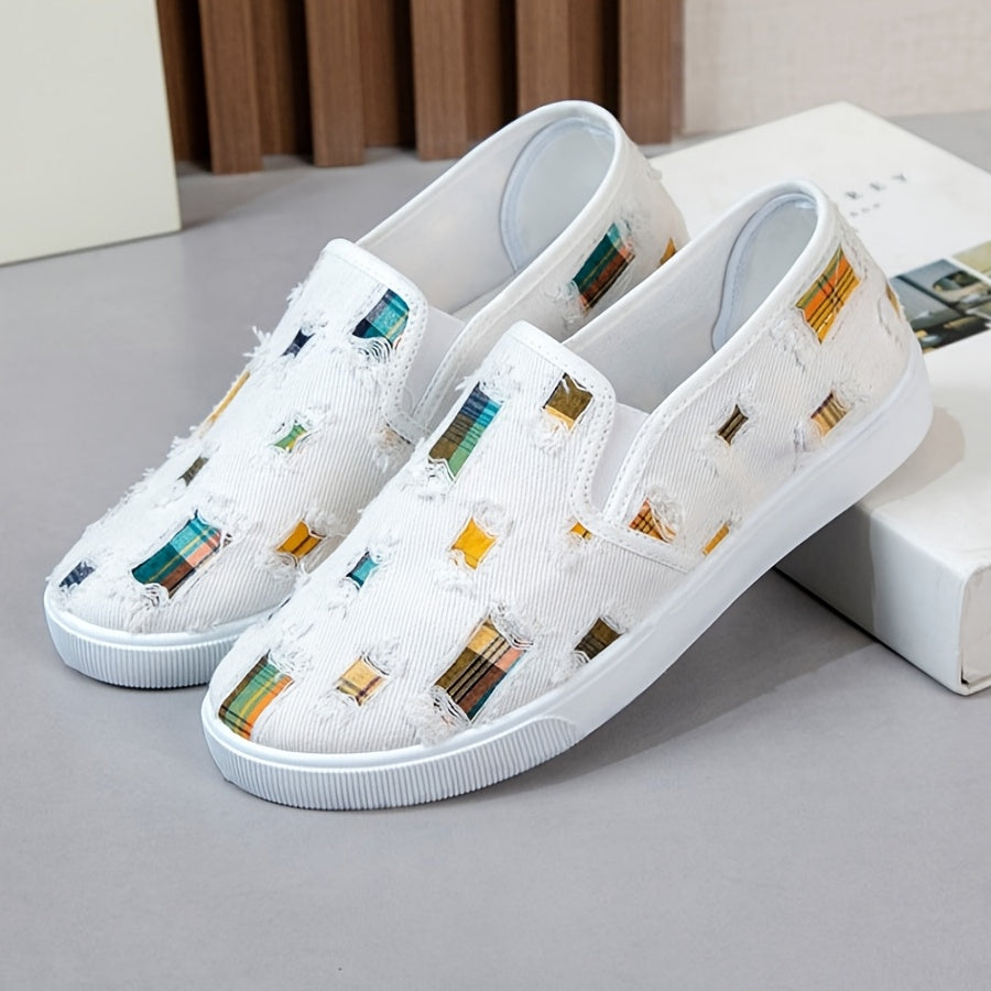 Women's Breathable Slip-On Sneakers, White Casual Shoes with Checkered Pattern