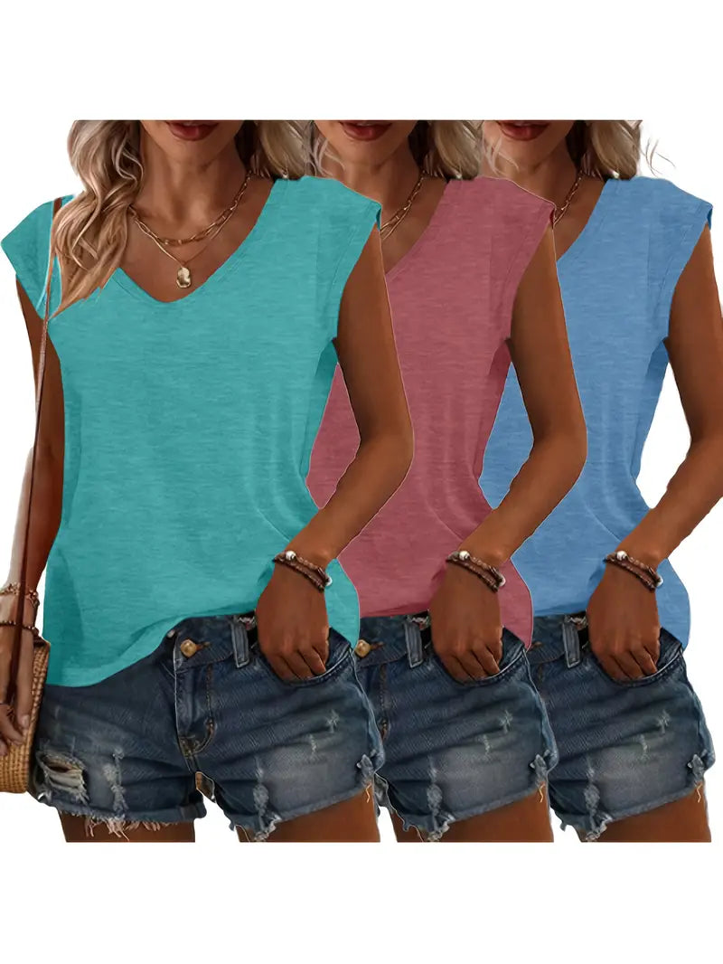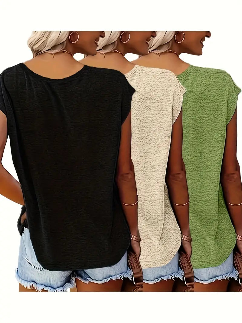 Women's Casual Solid Color V-Neck T-Shirts, Short Sleeve, Loose Fit, 3 Pack