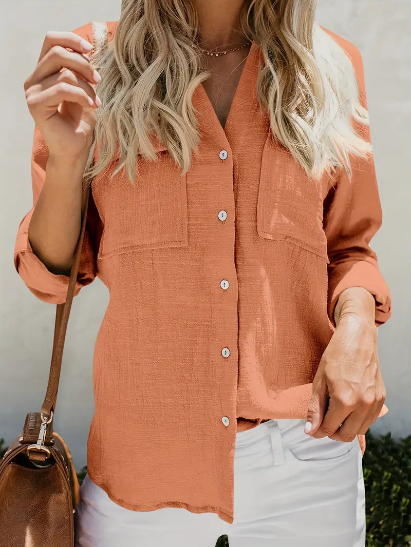 Women's Orange Cotton Blouse with V-Neck Button Front and Rolled Cuffs for Spring Fall