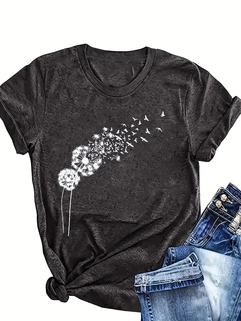 Women's Green T-Shirt with Dandelion & Birds Graphic Short Sleeve