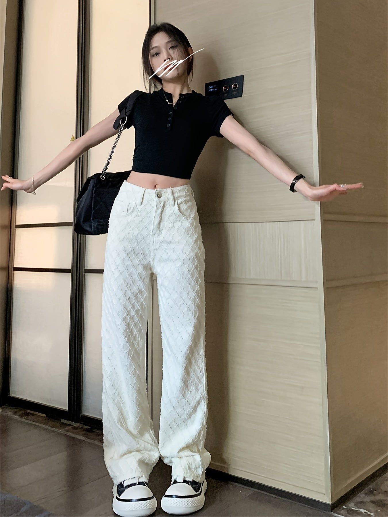 Women's Beige Textured Fabric Straight Leg Jeans with Slash Pockets