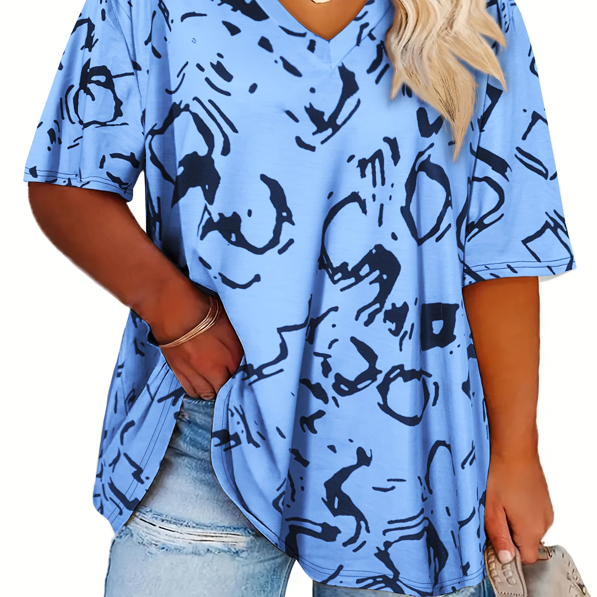 Women's Plus Size Abstract Print V-Neck T-Shirt Short Sleeve Summer Top Gray