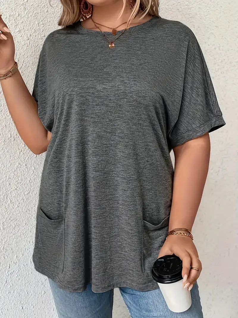 Women's Plus Size Casual Crew Neck T-Shirt with Pockets Short Sleeve Solid Polyester Blend