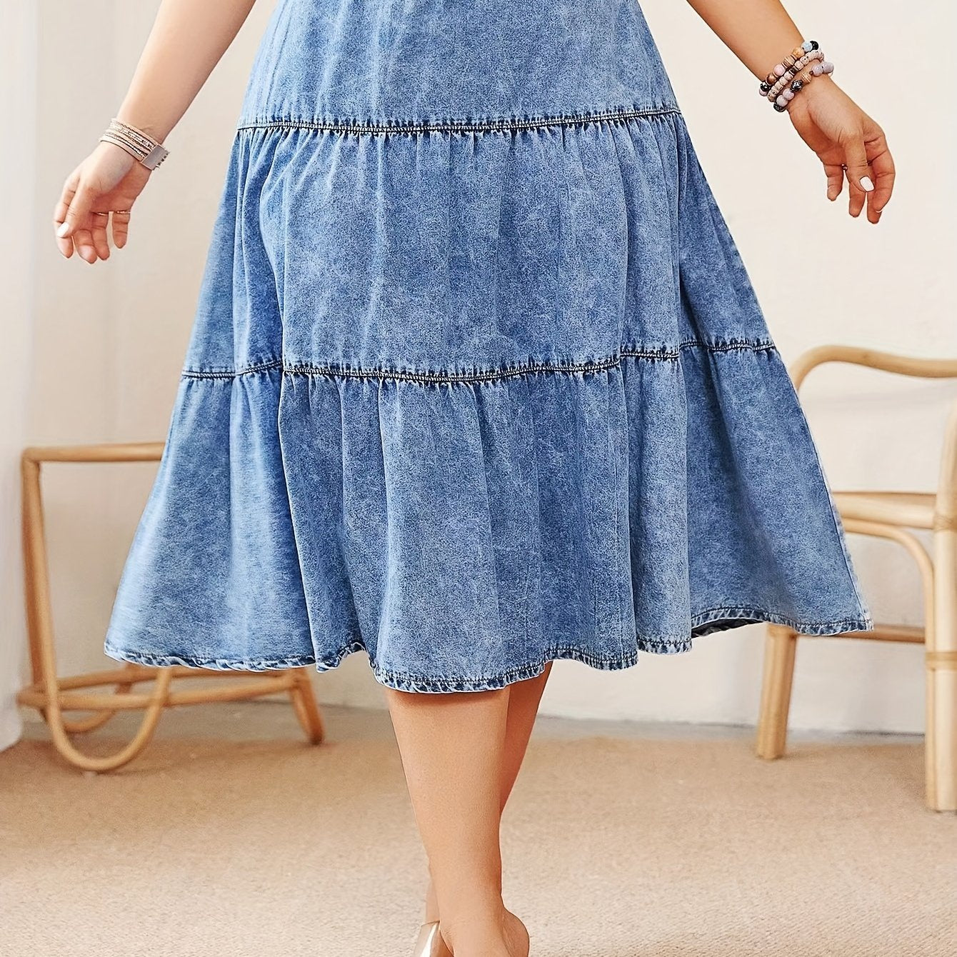 Women's Plus Size Denim Midi Skirt Tiered Ruffle A-line Blue Summer
