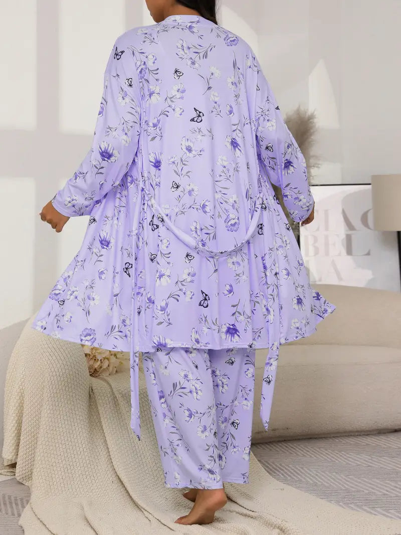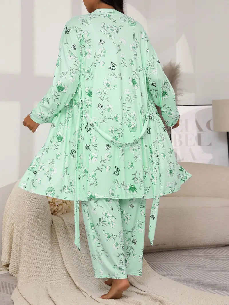 Plus Size Women's Floral Butterfly Print Pajama Set with Long Sleeve Robe Cami and Pants