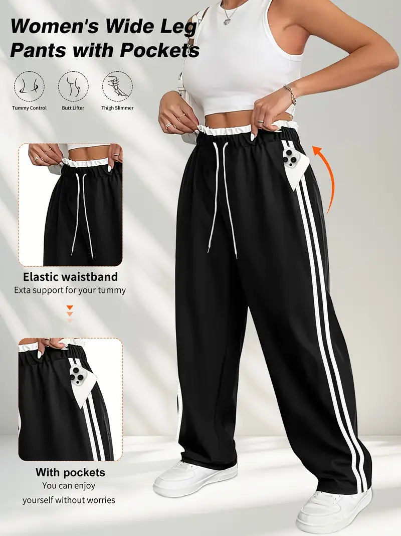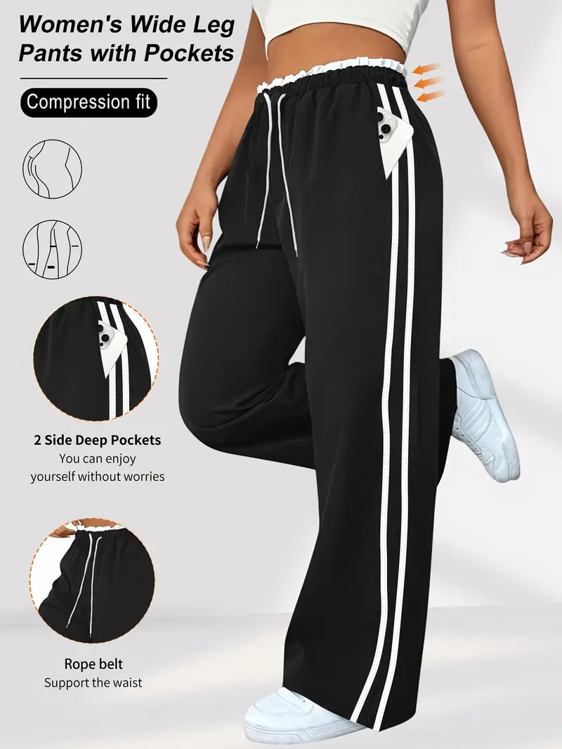 Women's Plus Size High-Waist Striped Joggers with Pockets, 7/8 Length Sports Pants