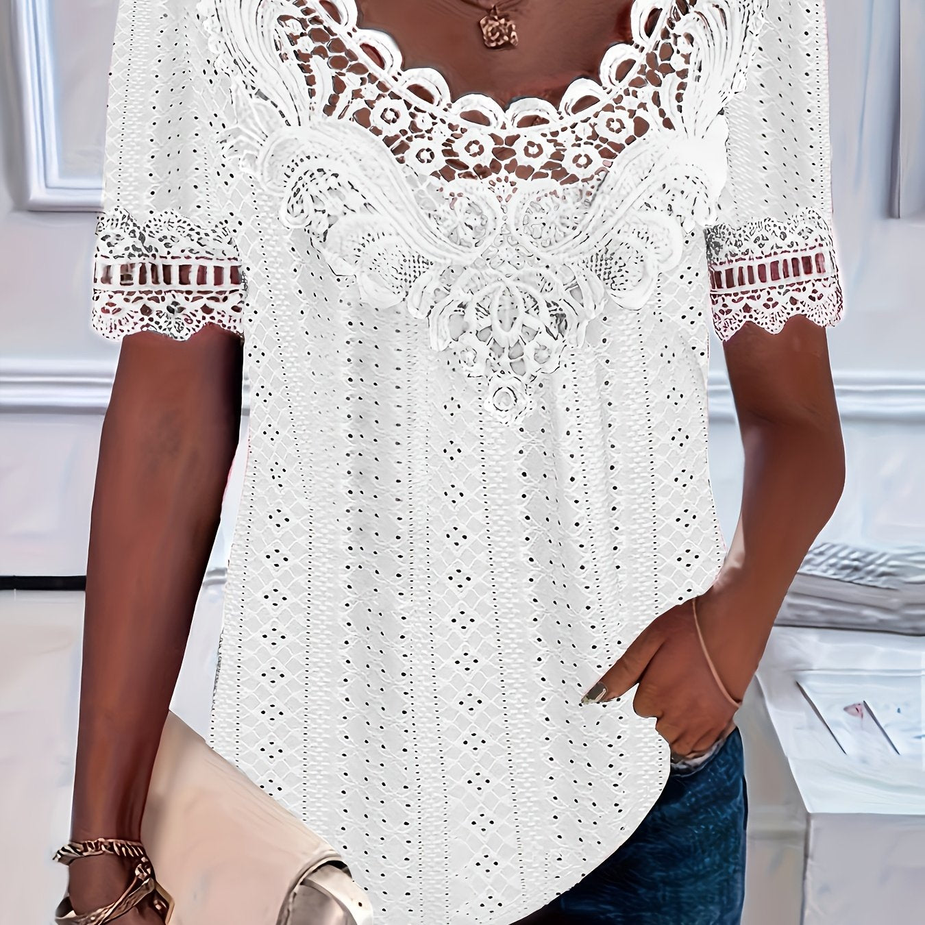 Women's Plus Size Lace Trim Short Sleeve Blouse Stretchy Semi-Sheer Fabric