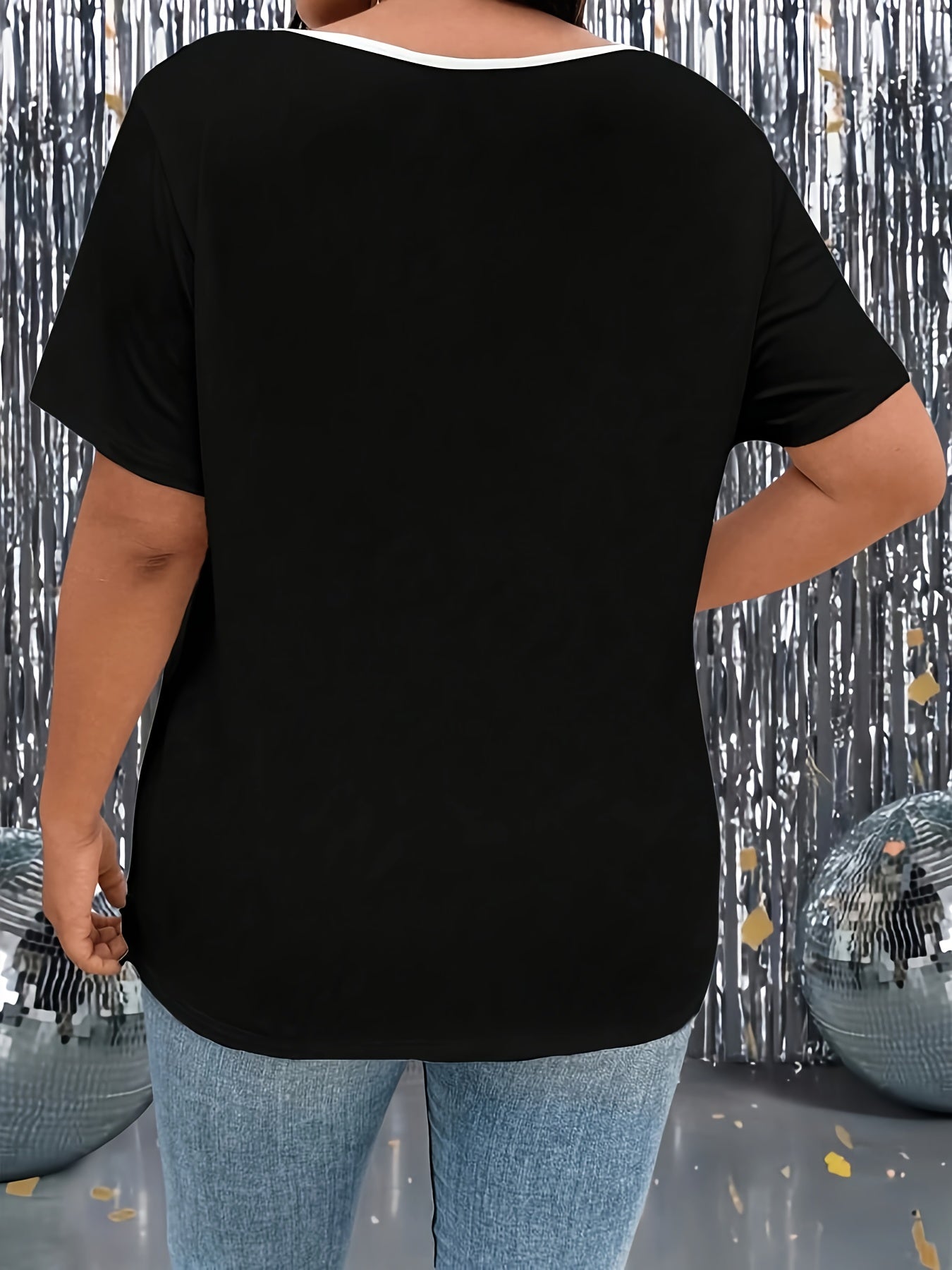 Women's Plus Size V-Neck Short Sleeve T-Shirt Black White Contrast Trim