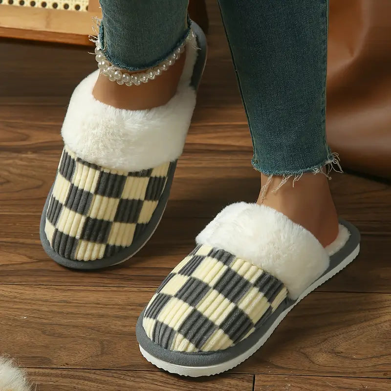 Women's Plush Striped Slippers Pink and White Checkered Indoor Shoes