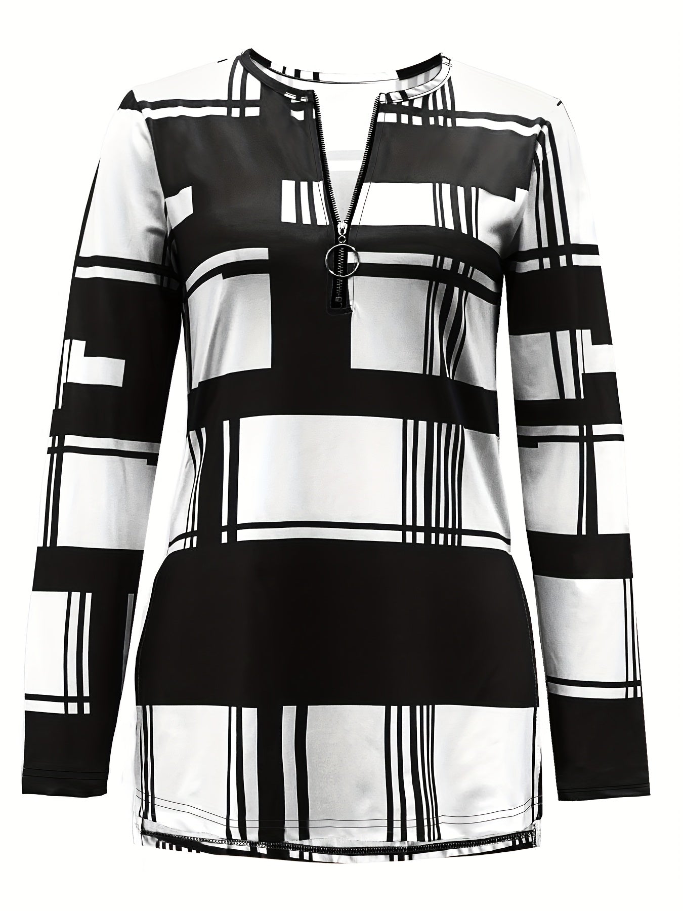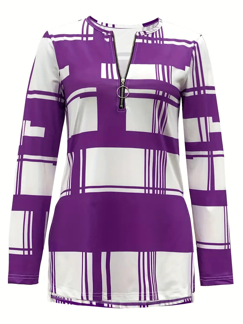Women's Purple White Patchwork Zip-Up Long Sleeve Crew Neck Knit Top