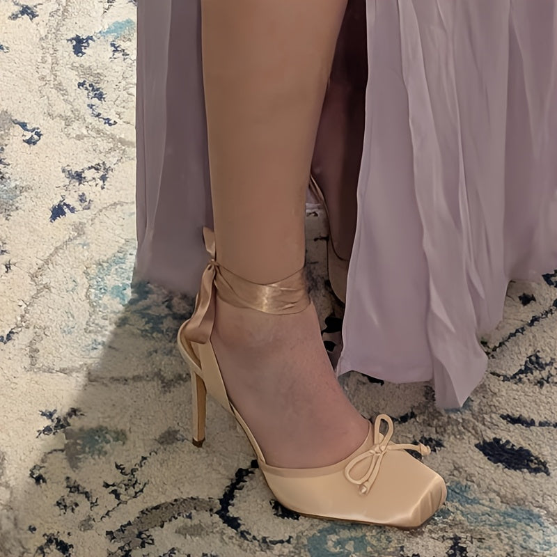 Women's Satin Bow Ankle Strap High Heels for Party Formal Events Apricot