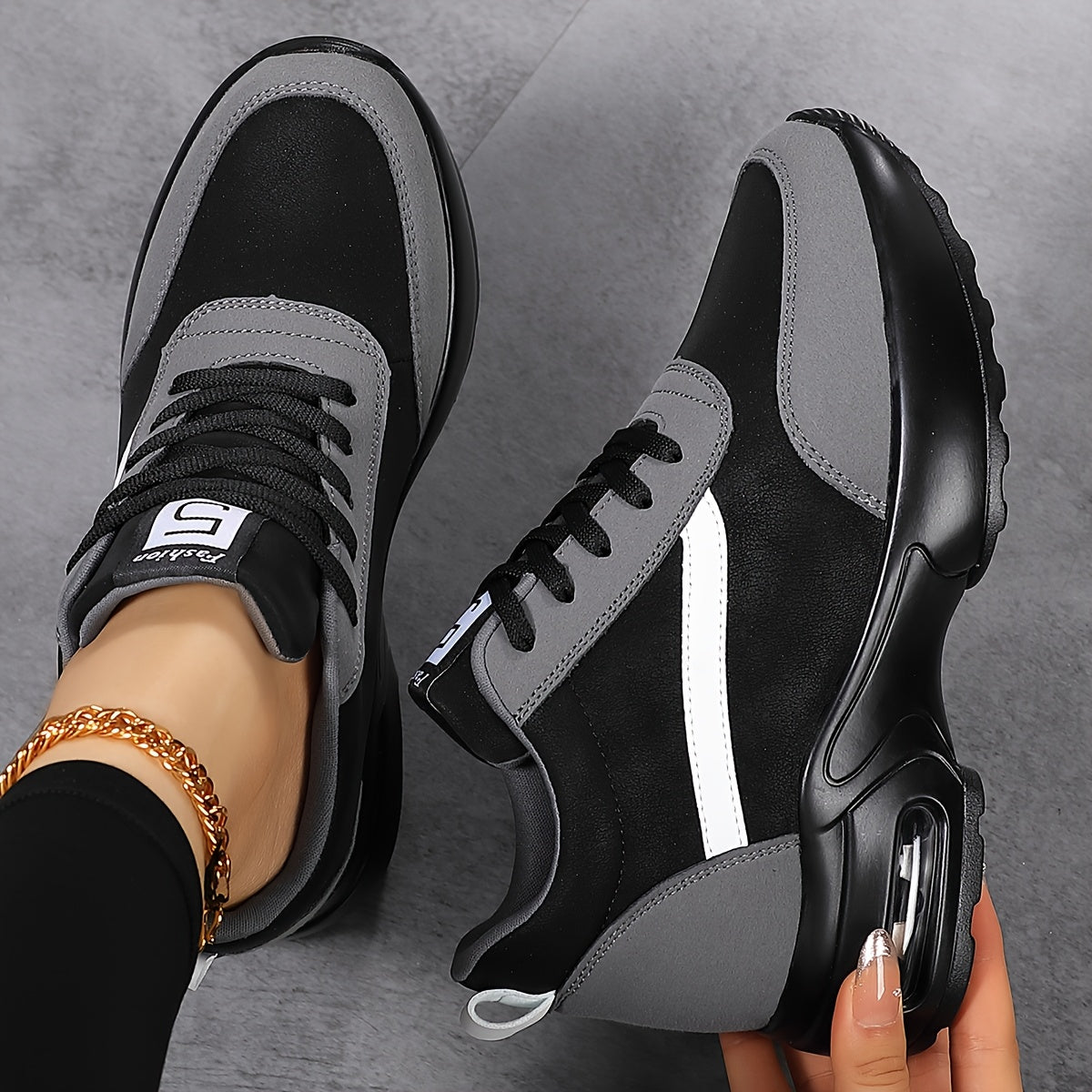 Women's Sneakers Leather-Style Low-Top Lace-Up Cushioned Non-Slip Black Gray