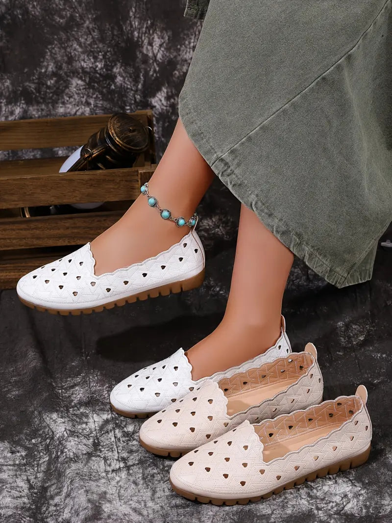 Women’s Vintage-Inspired Cut-Out Ballet Flats Slip-On Comfortable Shoes White Beige