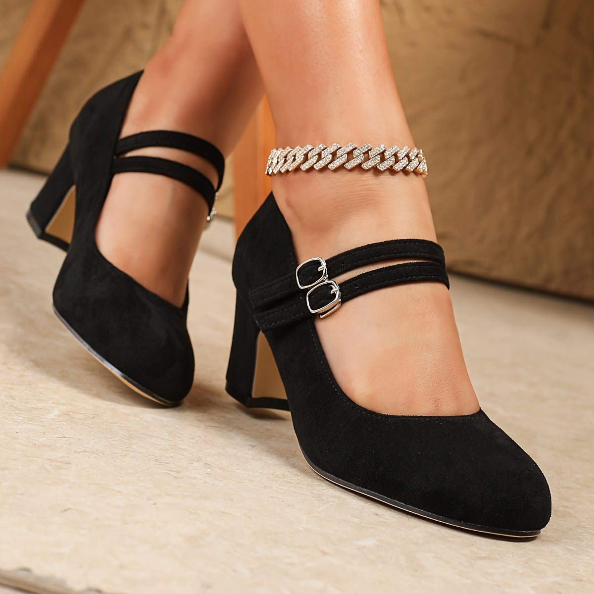 Women Vintage Mary Jane Chunky Heel Pumps Black Fabric Shoes