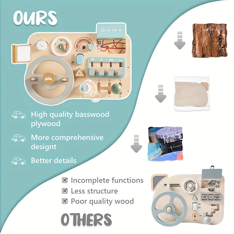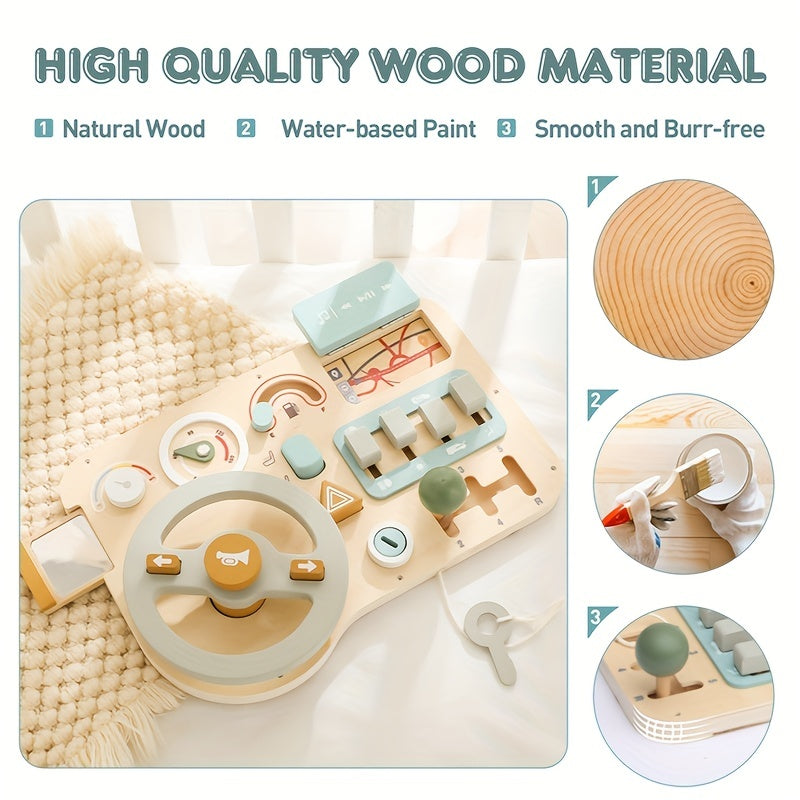 Wooden Busy Board Toy for Kids Age 18 Months Plus with Vehicle Sign Recognition and Motor Skills Development in Light Green Blue Yellow