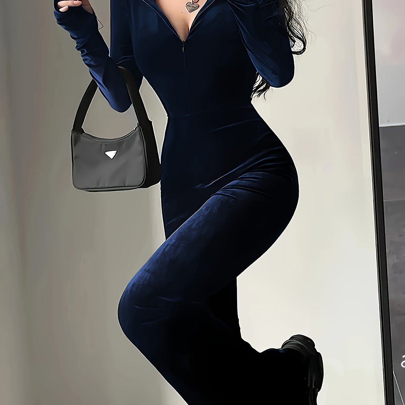 Women's Zipper Front Jumpsuit Hooded Long Sleeve Casual Fall Spring Knit Polyester Solid