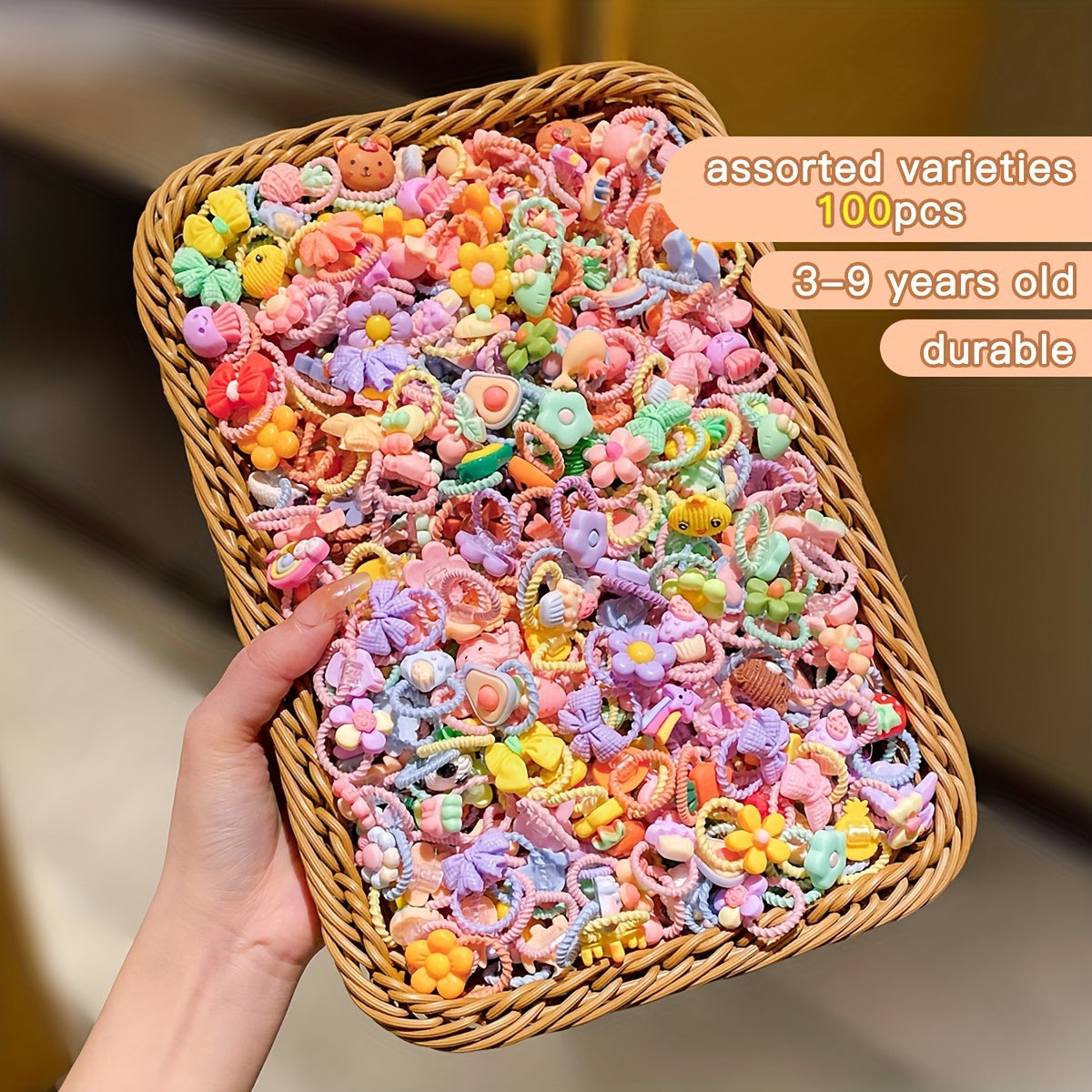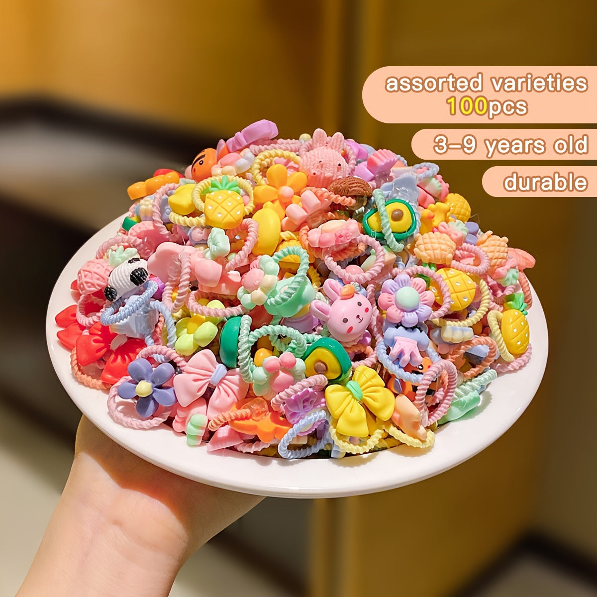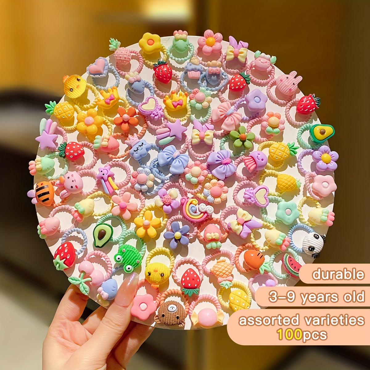 Anillos de pelo con hilos de dibujos animados coloridos para niños de 3 a 14 años, accesorios de resina, paquete de 100