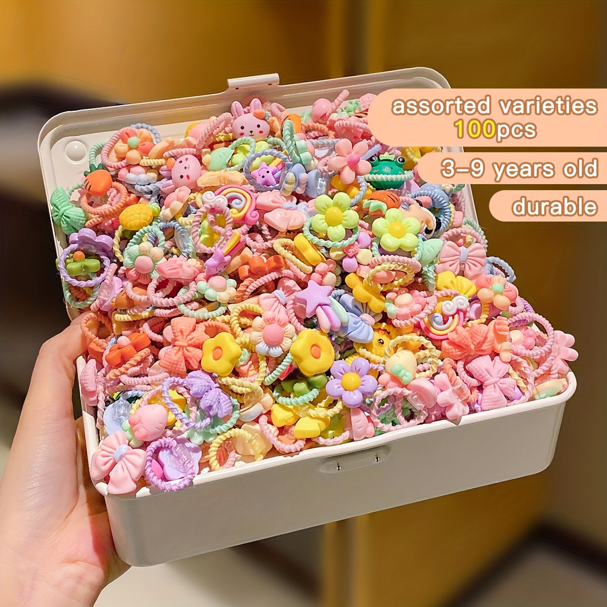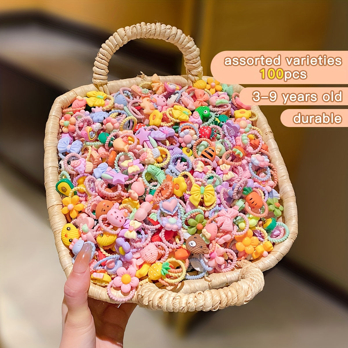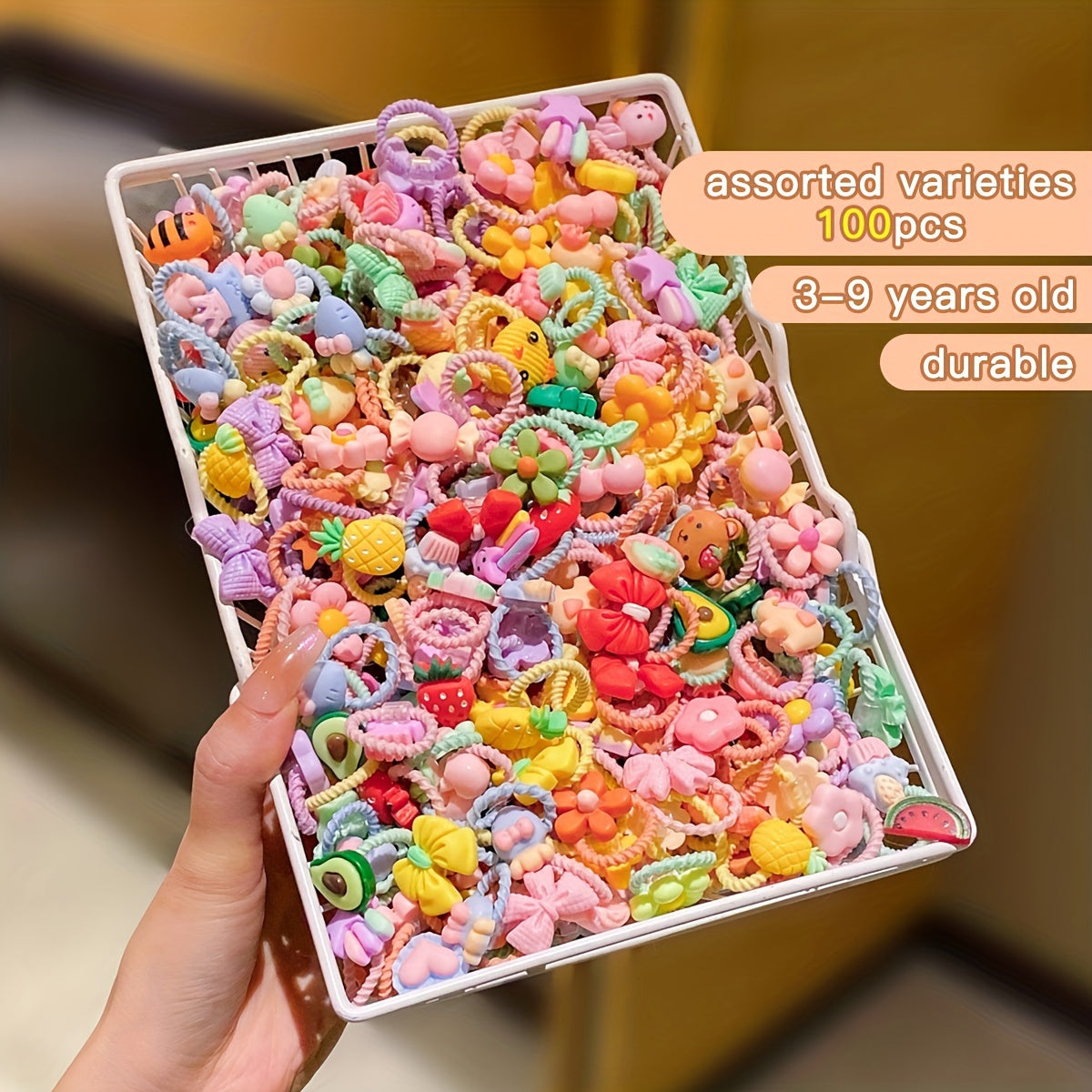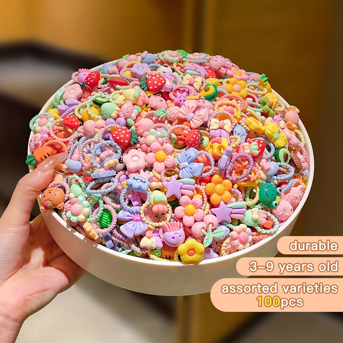 Anillos de pelo con hilos de dibujos animados coloridos para niños de 3 a 14 años, accesorios de resina, paquete de 100