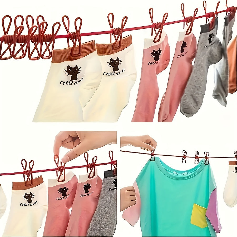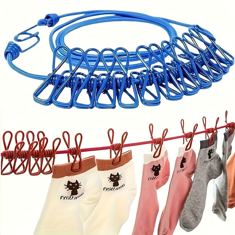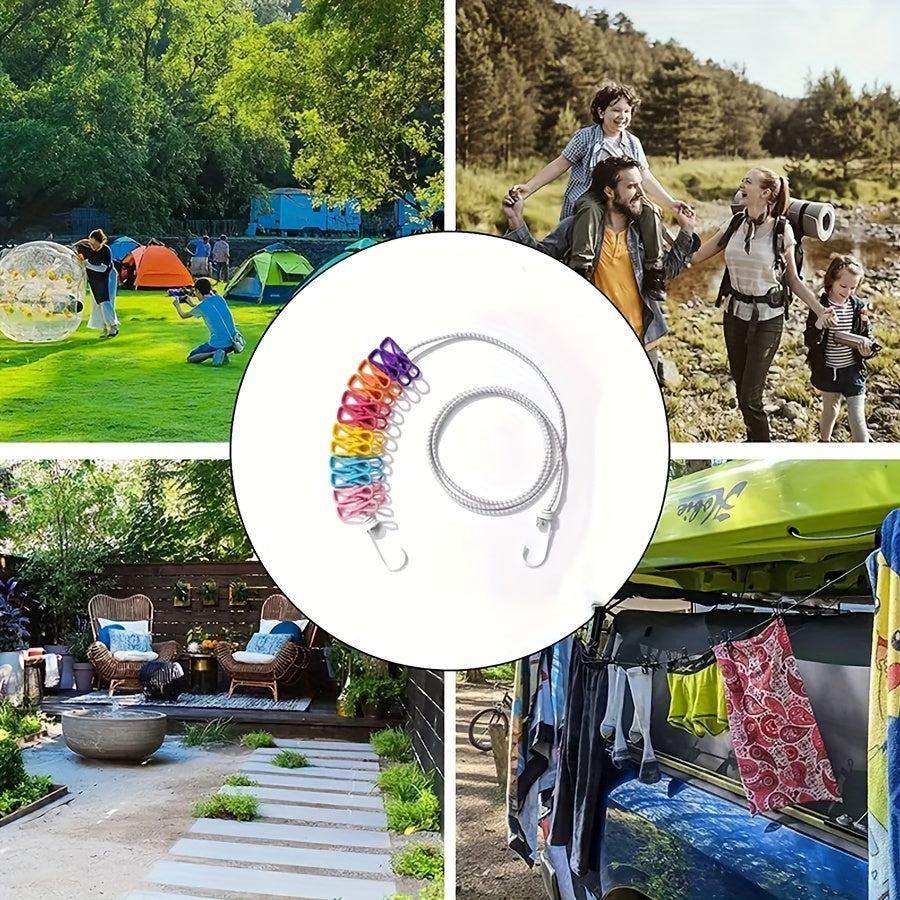 Conjunto de cuerda para tender con pinzas, cuerda elástica, alambre de metal, clips de PVC, para exteriores, línea de secado para viajes