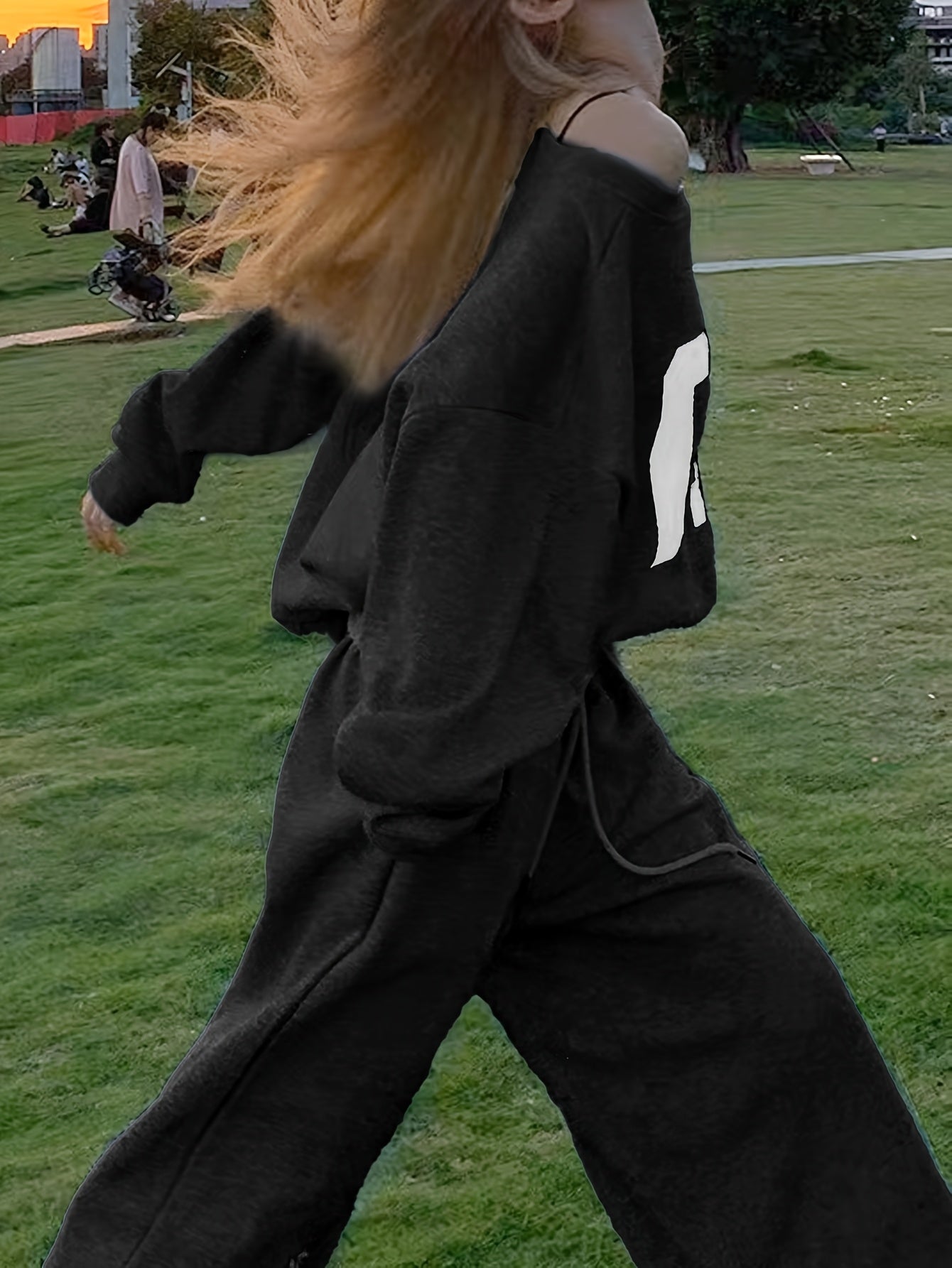 Conjunto de top y pantalones jogger de manga larga con letras y cuello asimétrico para mujer
