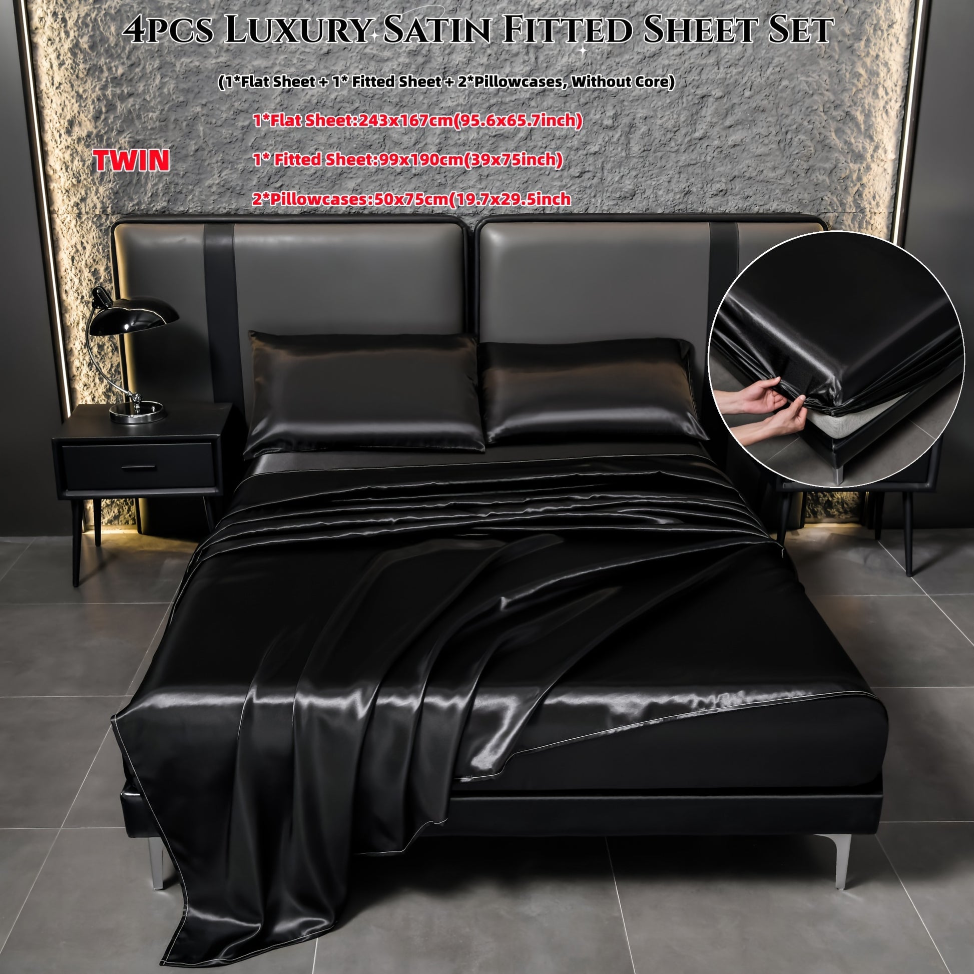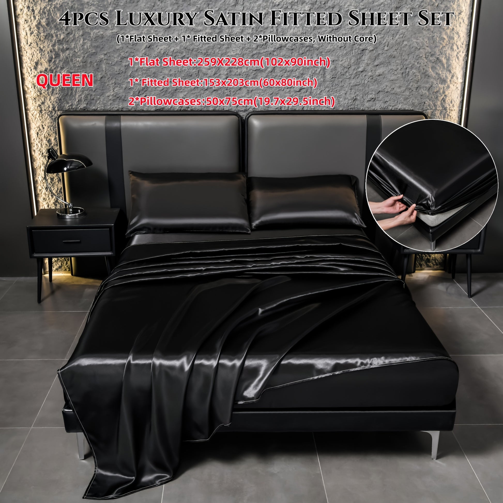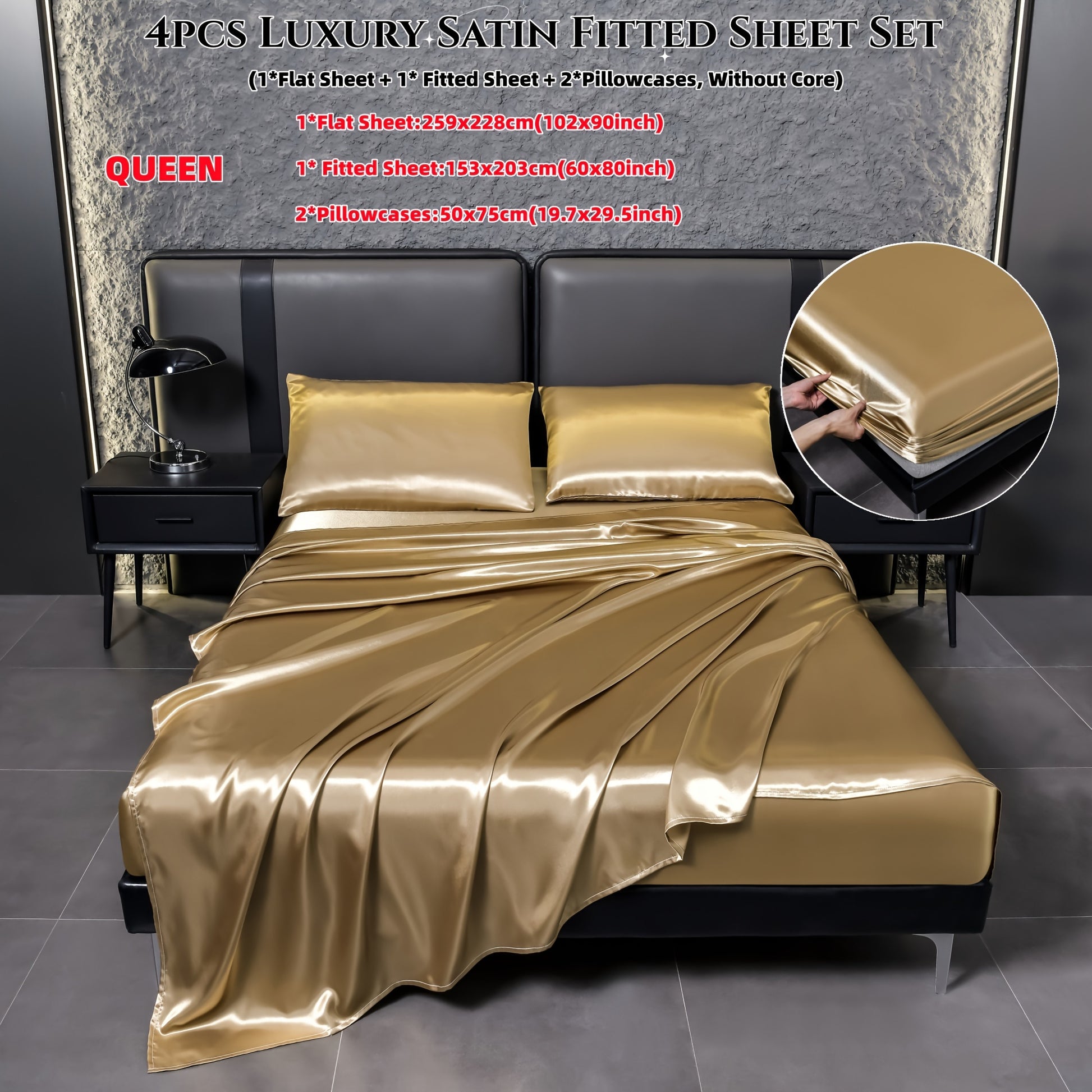 Juego de sábanas de satén de 4 piezas, reversible, transpirable, antideslizante, de color sólido para dormitorio, invitados, hotel