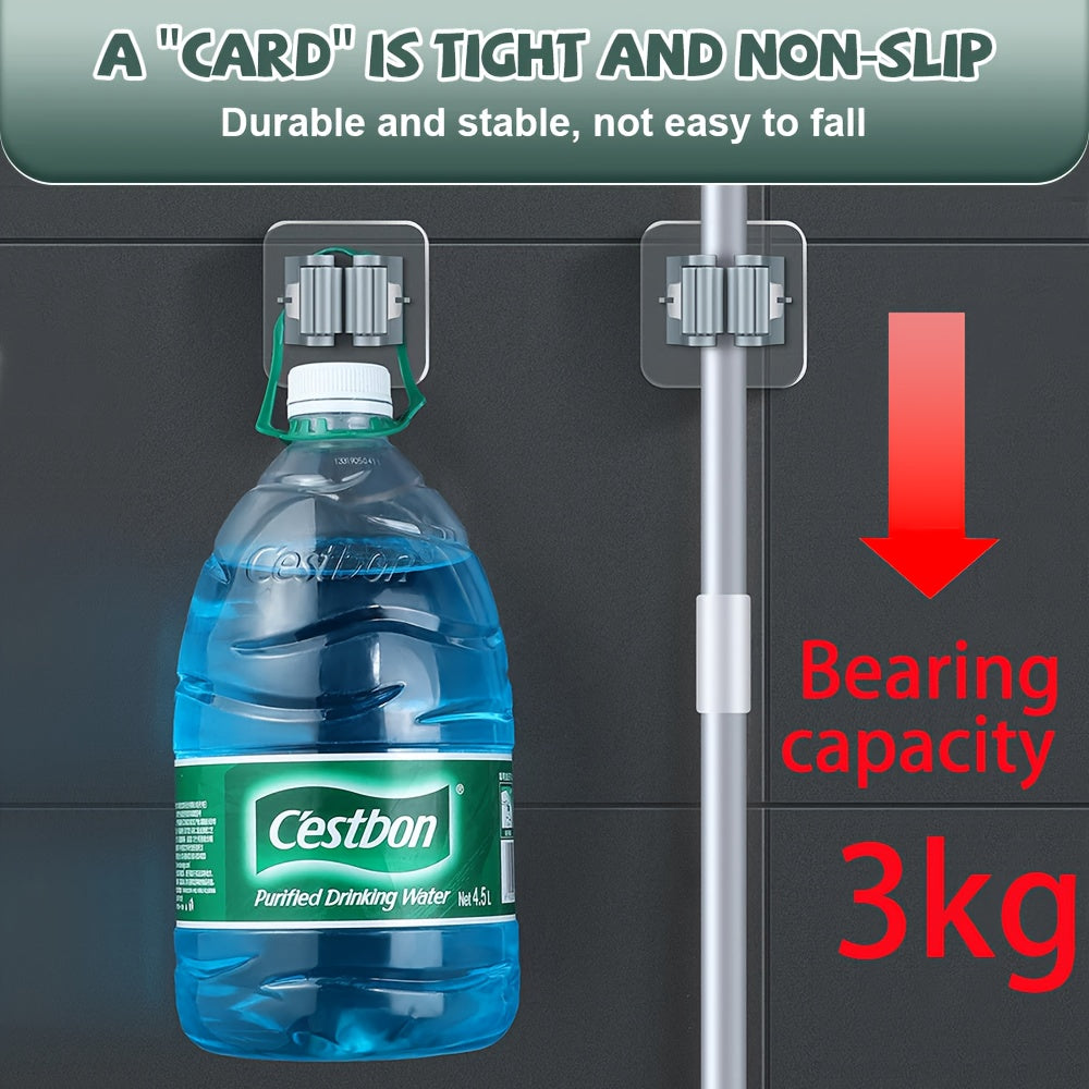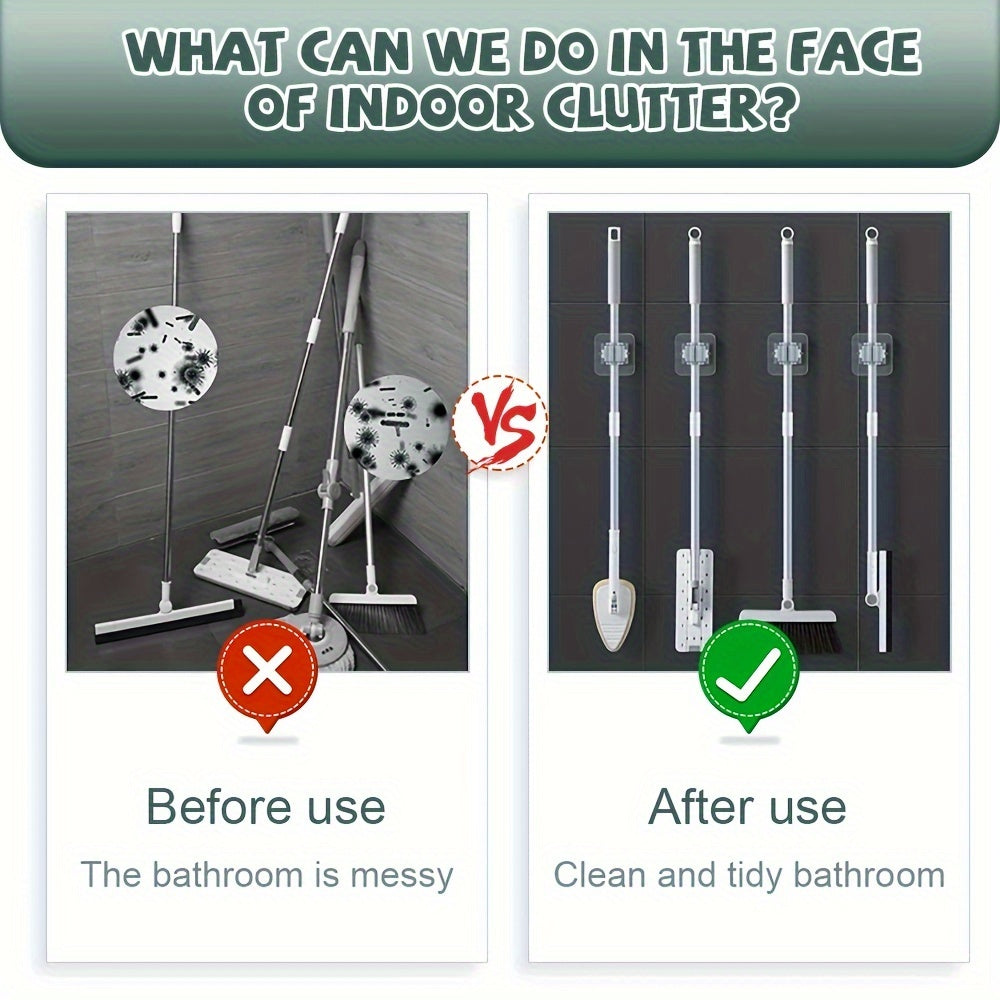 Soporte de pared blanco para trapeador y escoba con múltiples ganchos de plástico para almacenamiento en cocina y baño