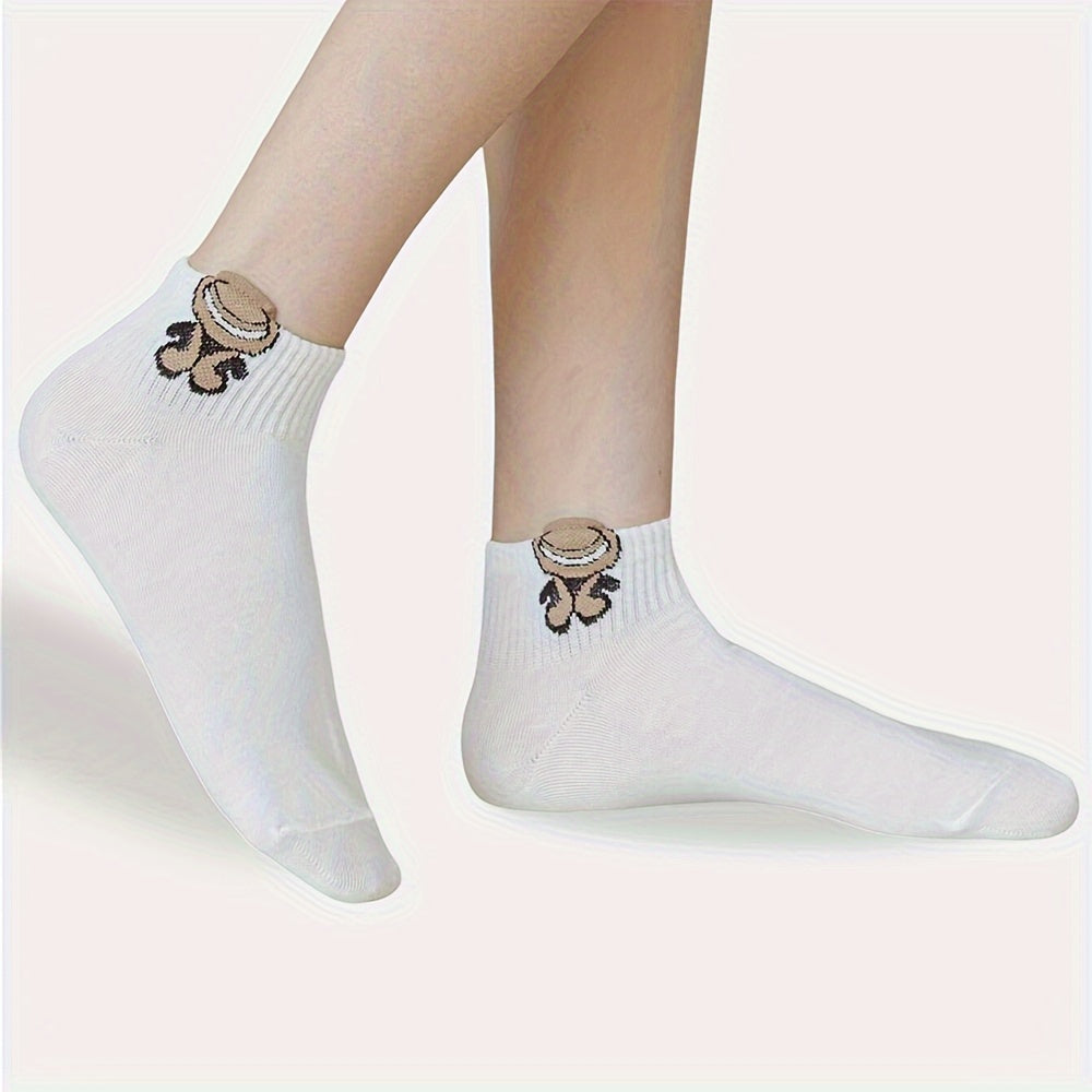 Pack de 5 calcetines cortos con estampado de dibujos animados blancos para mujer, de tela de punto transpirable