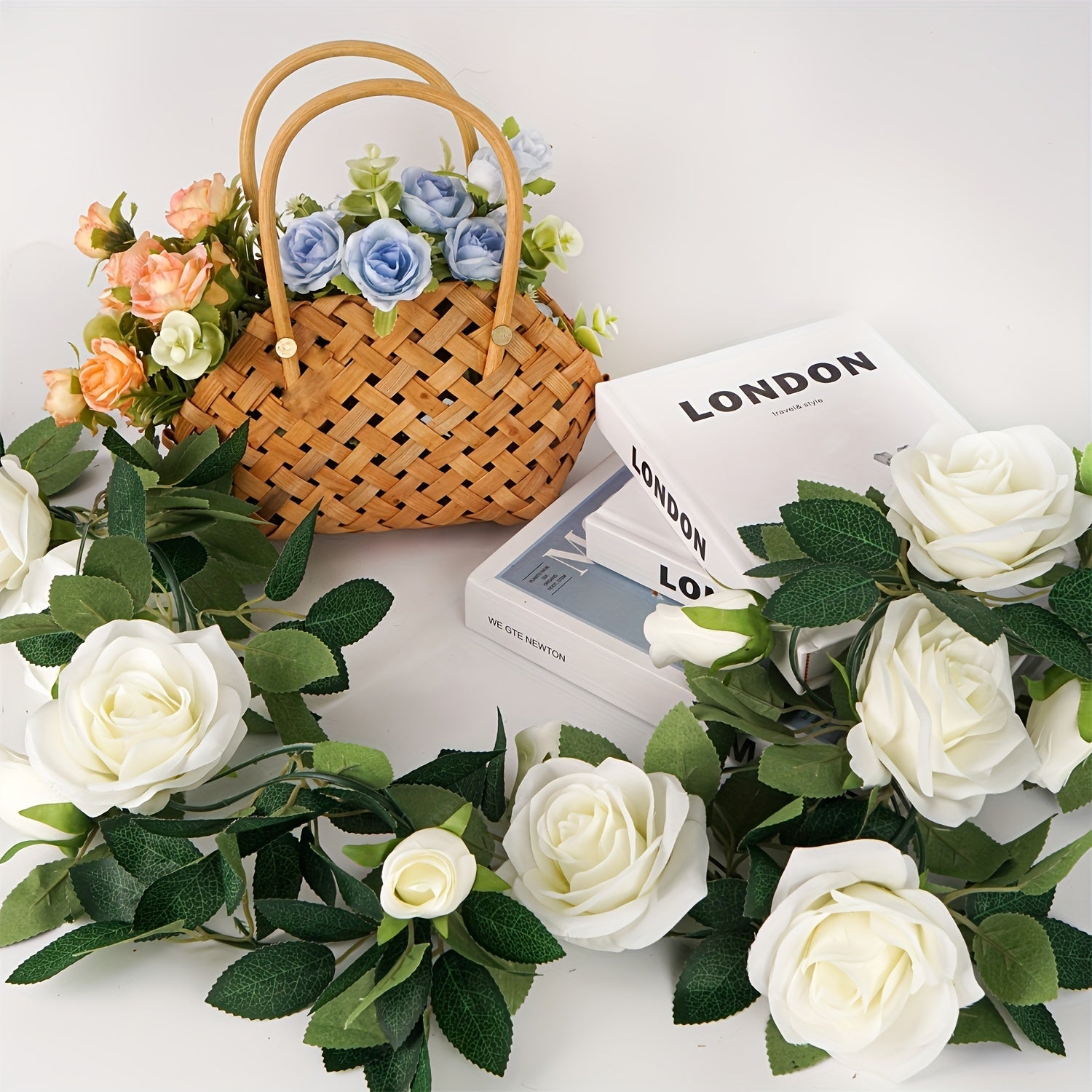 Guirnalda de rosas artificiales blancas de 6 metros para bodas, jardines y decoración navideña