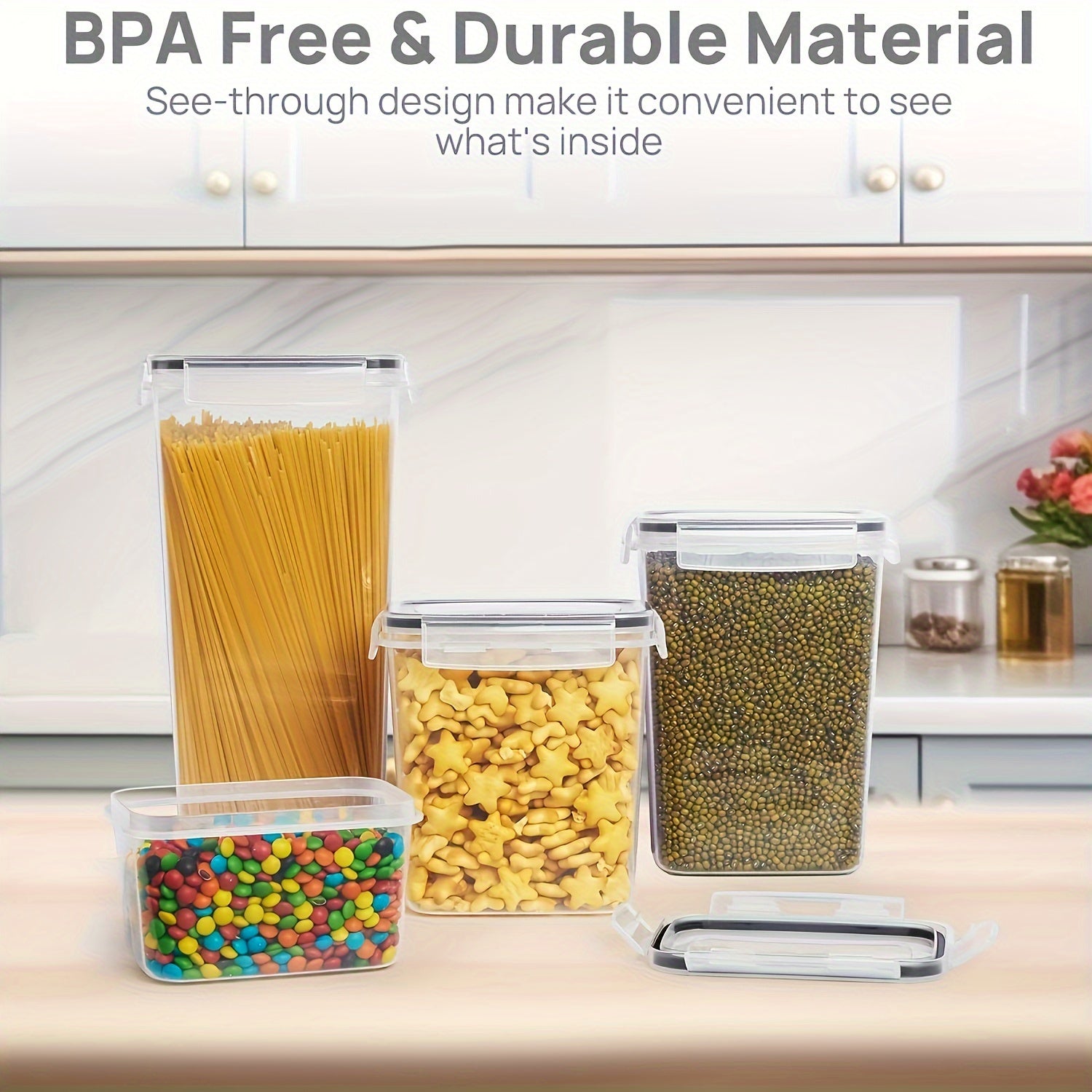 Nuestro conjunto de recipientes de almacenamiento para cocina ofrece 5 tamaños diferentes para adaptarse a tus necesidades. El conjunto incluye un recipiente alto (2.5 cuartos/2.8 litros), 2 recipientes grandes (1.8 cuartos/2.0 litros), 1 recipiente mediano (1.5 cuartos/1.6 litros), 1 recipiente pequeño (1.1 cuartos/1.2 litros) y 2 mini recipientes (0.7 cuartos/0.8 litros). Ideal para almacenar diversos productos secos como ingredientes para hornear, cereales, harina, azúcar, avena, pasta, arroz, café, té, snacks y nueces. Asegúrate de sellar bien ---- Nuestros recipientes herméticos para alimentos están equipados con tapas de bloqueo lateral que garantizan una frescura óptima y una conservación prolongada de los alimentos al sellar de manera segura. Protegen tus alimentos del aire y la humedad, ¡así que despídete de las preocupaciones por que tus alimentos favoritos se pongan rancios! Por favor, asegúrate de que la tapa esté bien alineada para un cierre seguro. Estos recipientes de almacenamiento para la despensa están fabricados con plástico de alta calidad libre de BPA, garantizando buena calidad. Son duraderos y estéticamente agradables, lo que los convierte en una inversión valiosa. El plástico transparente te permite ver fácilmente el contenido de cada recipiente, facilitando la localización rápida de lo que necesitas sin tener que abrir cada uno. Al utilizar un diseño apilable, estos recipientes de plástico optimizan el espacio en tu cocina, haciéndola más funcional. Independientemente del tamaño de tu despensa, estos resistentes recipientes te ayudarán a organizar tu cocina y despensa de manera más eficiente. Son fáciles de limpiar y aptos para lavavajillas, pero por favor, lava la tapa a mano. Transforma tu despensa con nuestras soluciones de almacenamiento innovadoras ---- Di adiós a las bolsas de harina y azúcar desordenadas optando por nuestros prácticos recipientes de almacenamiento de alimentos. Estos recipientes aportarán un sentido de organización y orden a tu cocina. Completos con 7 frascos de alta calidad, etiquetas y un marcador, también son un regalo perfecto para cualquier hogar.