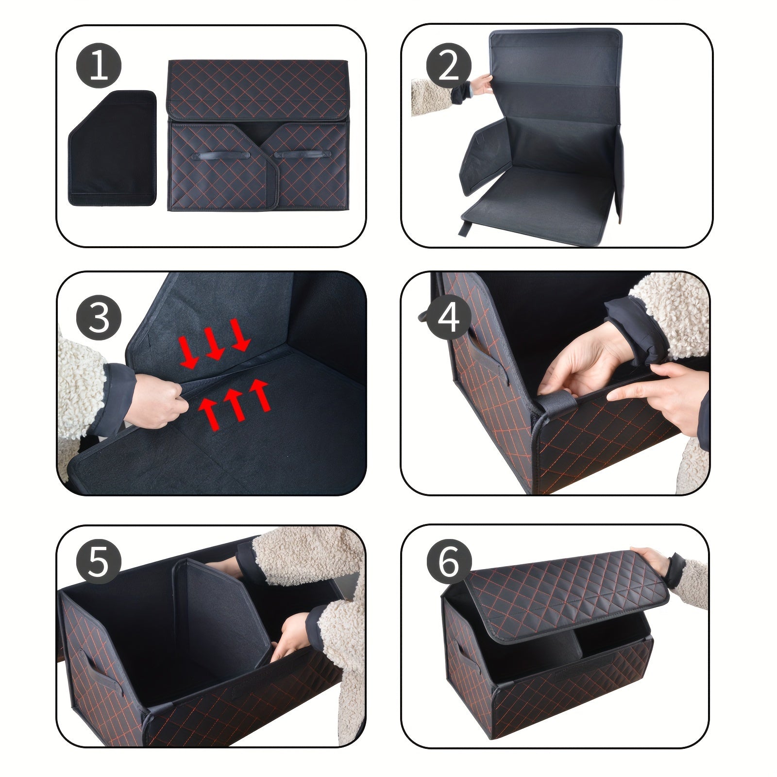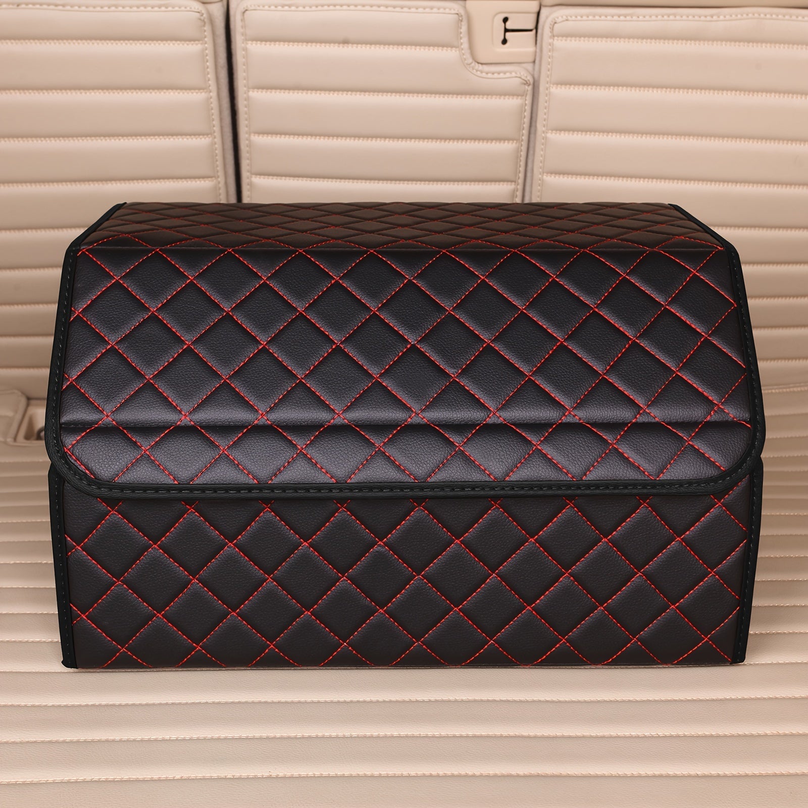 Organizador de maletero de coche plegable de cuero PU con costura de diamantes y acentos rojos para coches, camiones y SUVs