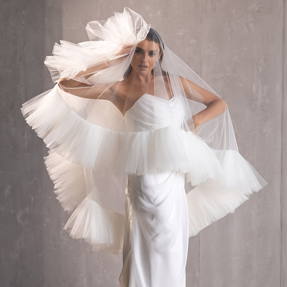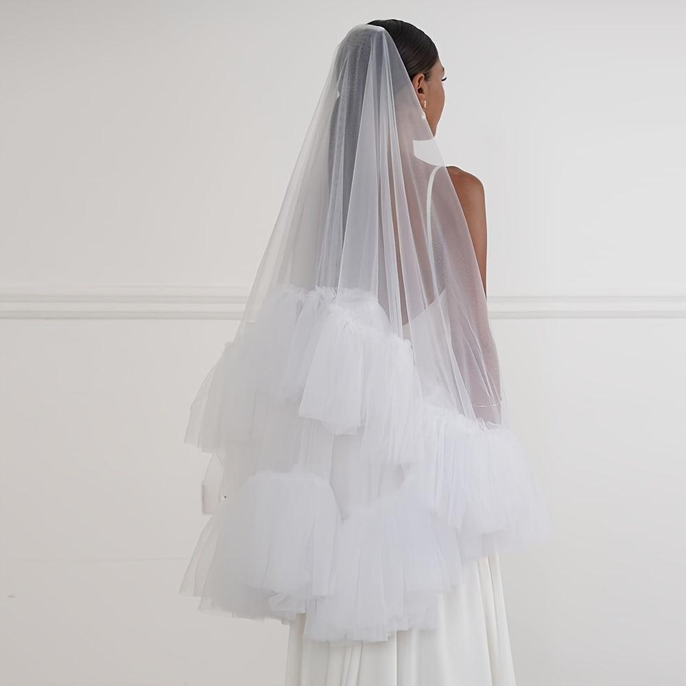 Velo de novia con borde de volante y detalle de borla, diseño de volante en capas, lavable a mano