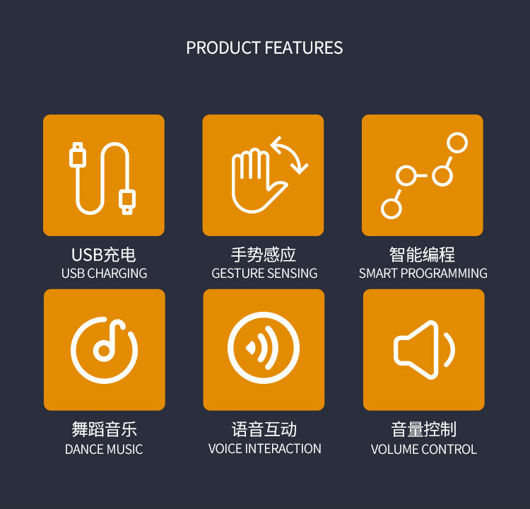 Descripción de funciones: avanzar, retroceder, girar a la izquierda, girar a la derecha, caminar hacia adelante, correr, detección de gestos, canto y baile, programación, control de volumen, lenguaje de máquina