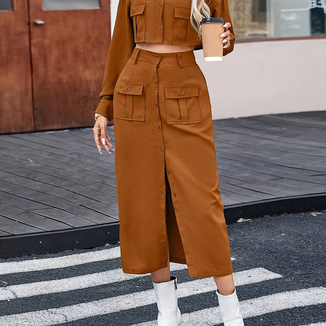 Conjunto de blusa de color sólido para mujer y falda midi de poliéster, primavera y otoño, elegante
