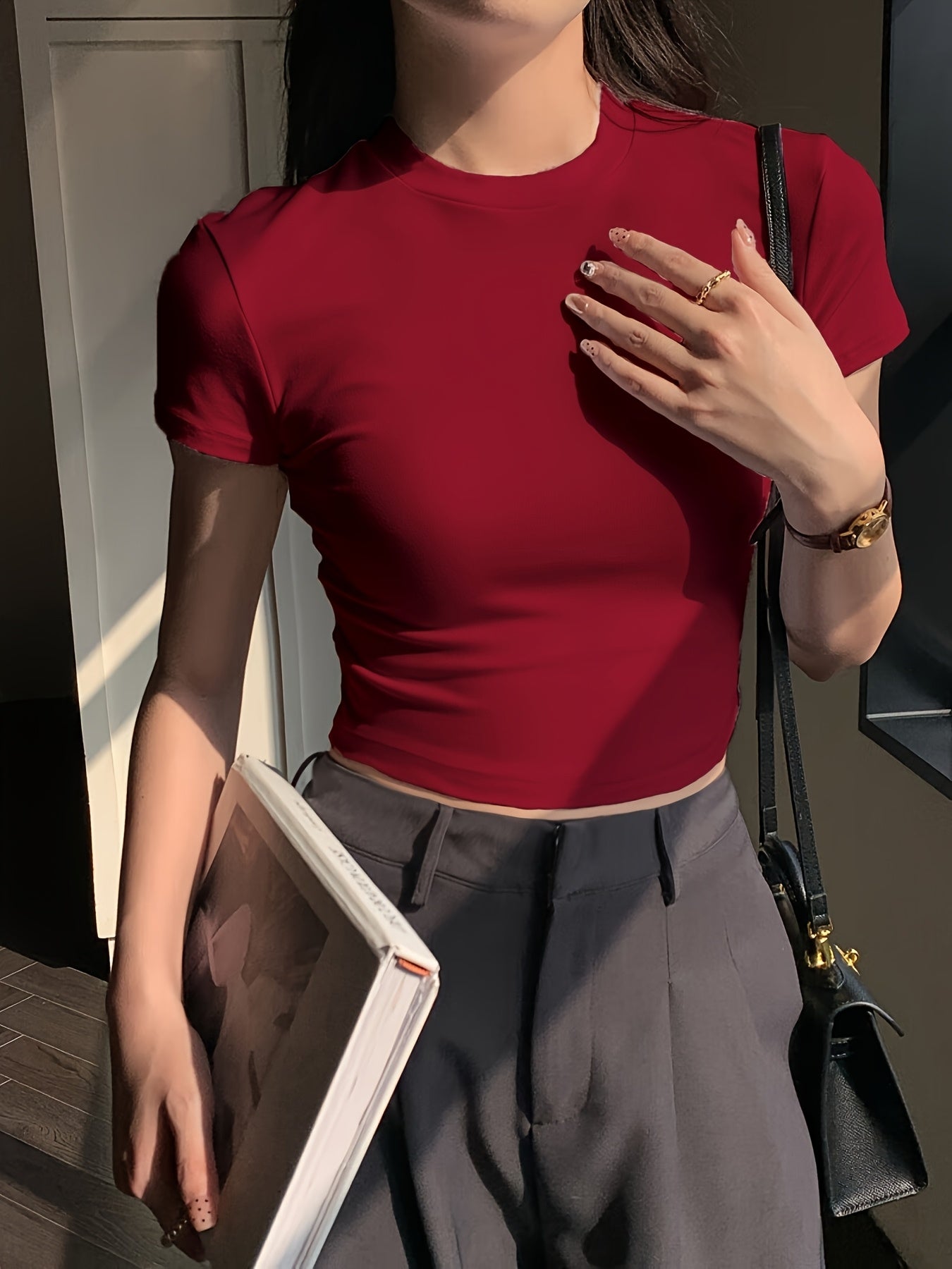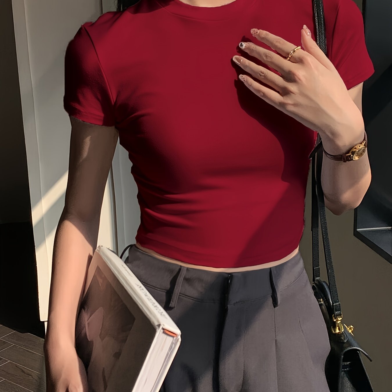 Camiseta elegante de manga corta para mujer, poliéster y spandex, cuello redondo, primavera y verano