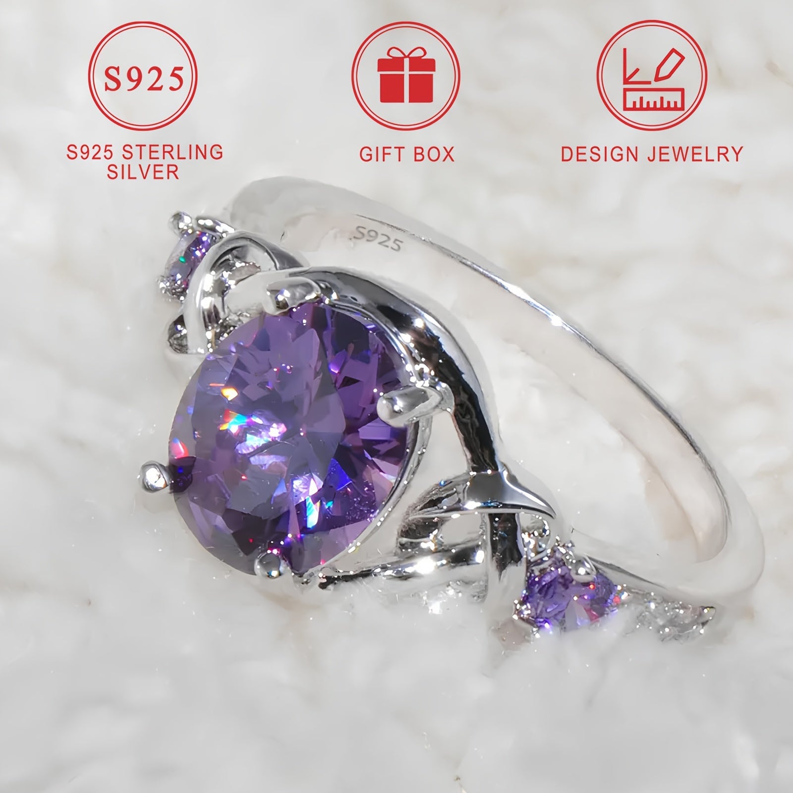 Anillo de compromiso de plata 925 con zirconia cúbica púrpura ovalada y diseño de nudo retorcido de 3 piedras