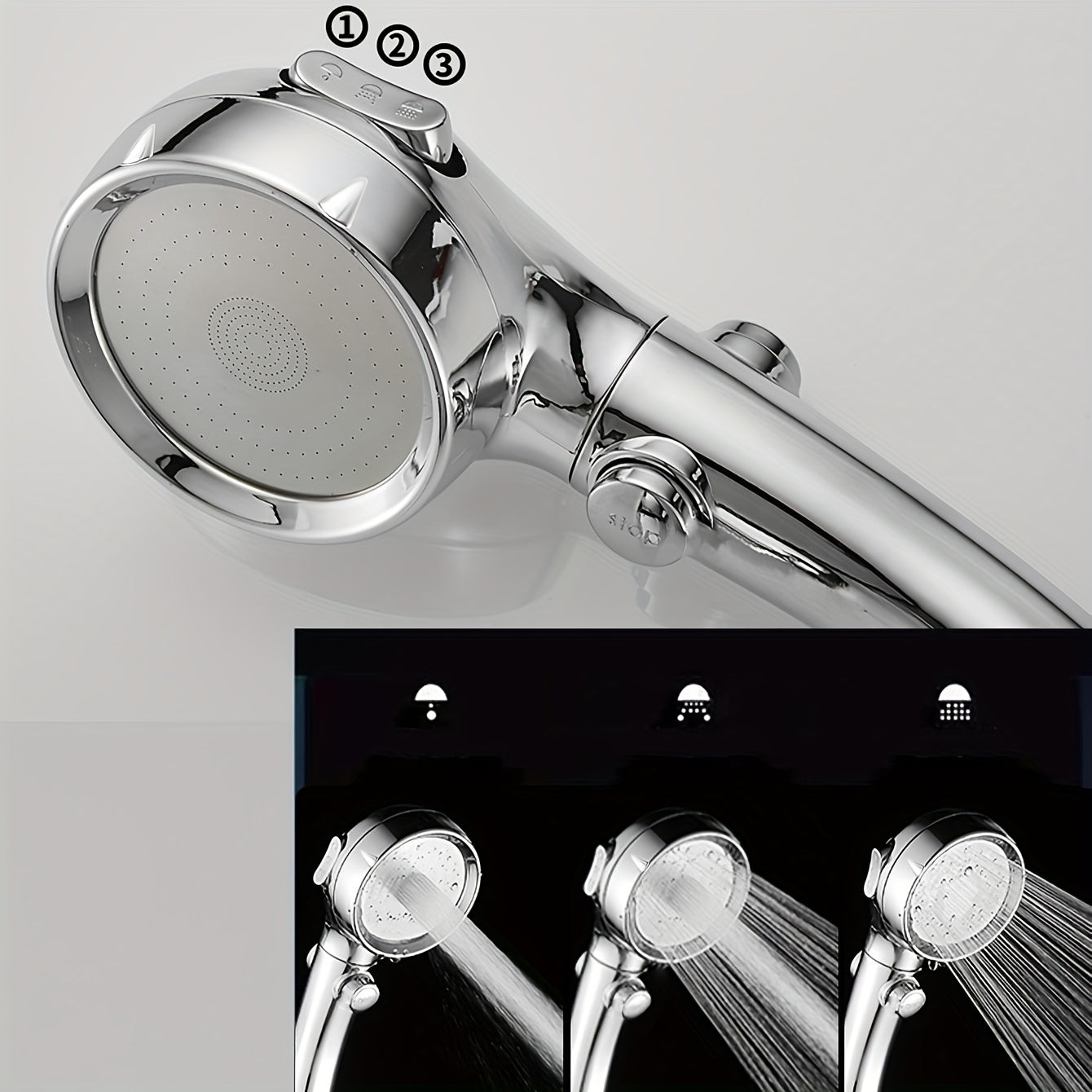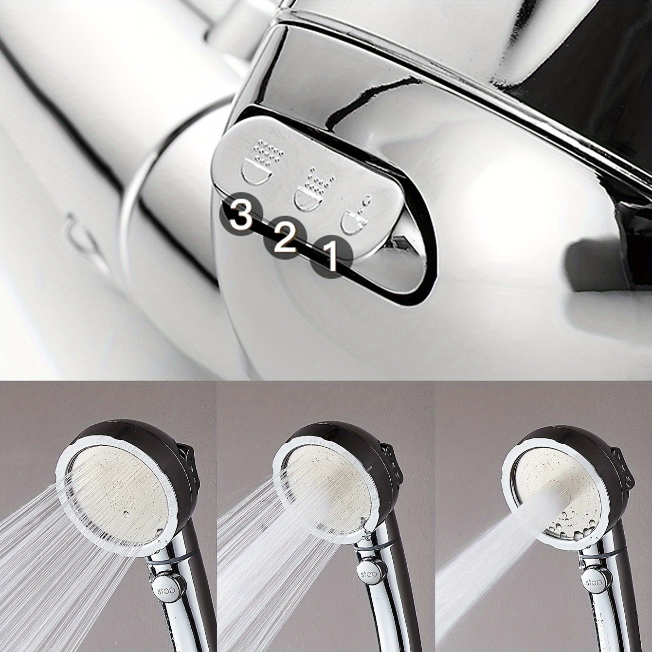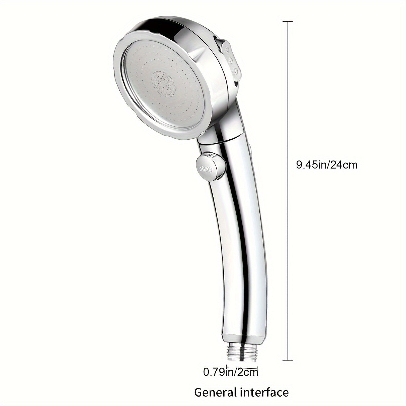 Cabezal de ducha de estilo alemán en plata con parada de agua con un botón y aumento de presión en tres velocidades