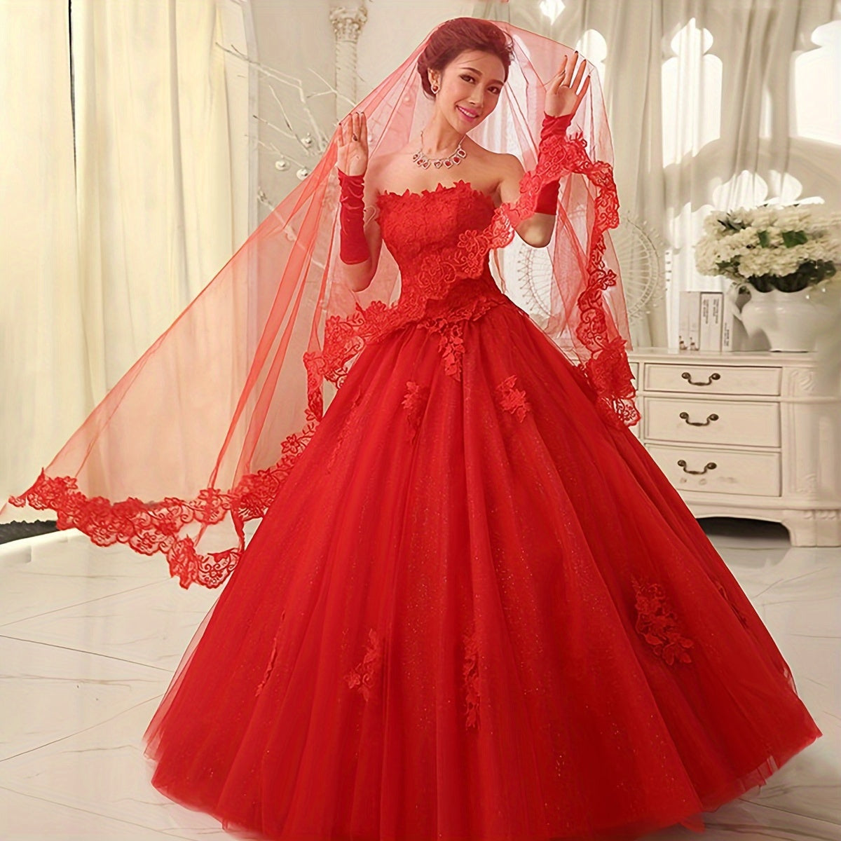 Velo de novia rojo con detalle de encaje y larga cola para bodas