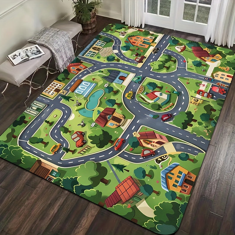 Alfombra de diseño de pueblo de dibujos animados verdes para habitaciones infantiles y espacios de estar