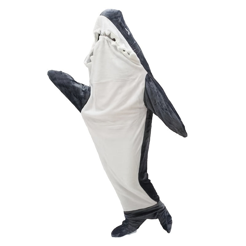Manta de felpa de franela en forma de tiburón gris y blanca con calentador de pies para adultos
