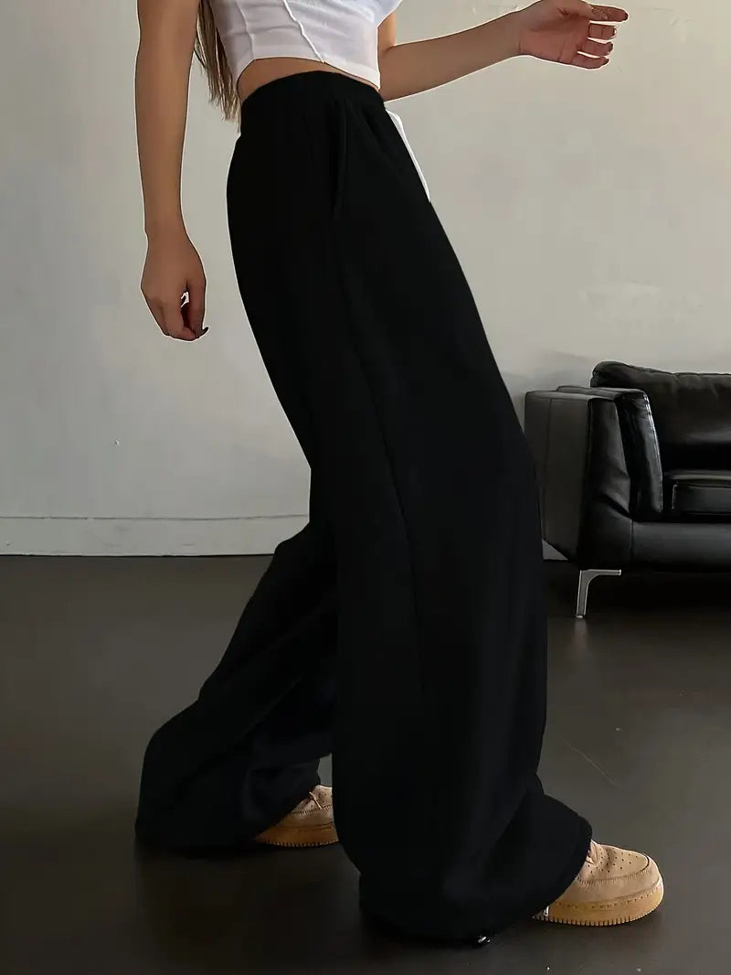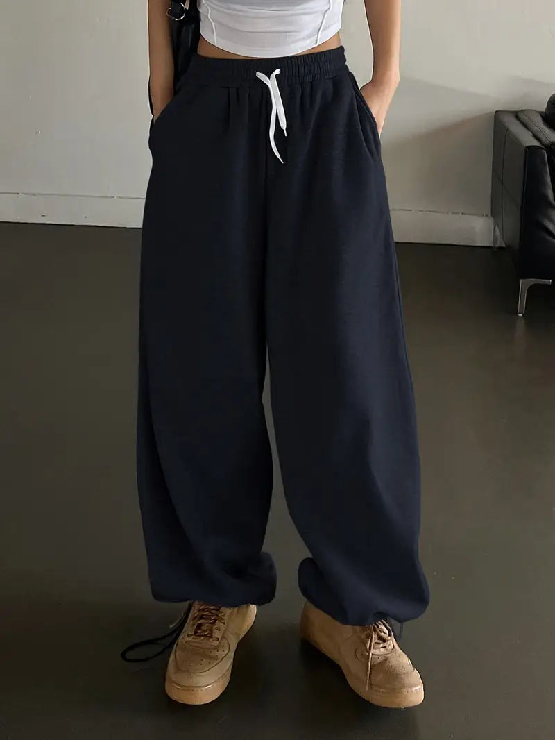 Pantalones jogger de cintura alta para mujer con cordón y bolsillos, corte holgado, pierna ancha, poliéster, casual para primavera y otoño