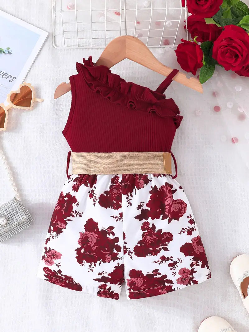 Pelele floral de un solo hombro para niña bebé con cinturón para salidas de verano
