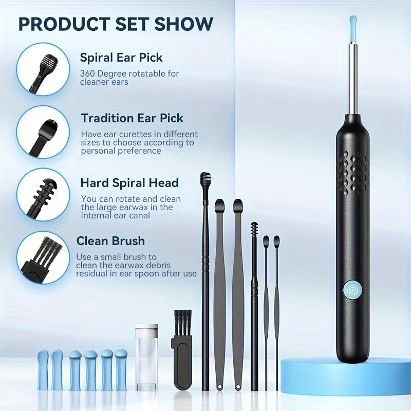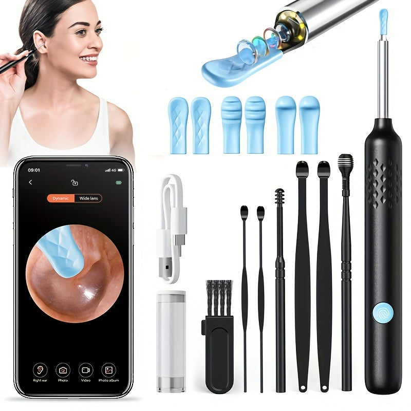 Kit de extracción de cera con otoscopio HD, recargable por USB, alimentado por batería, cámara intraural, negro