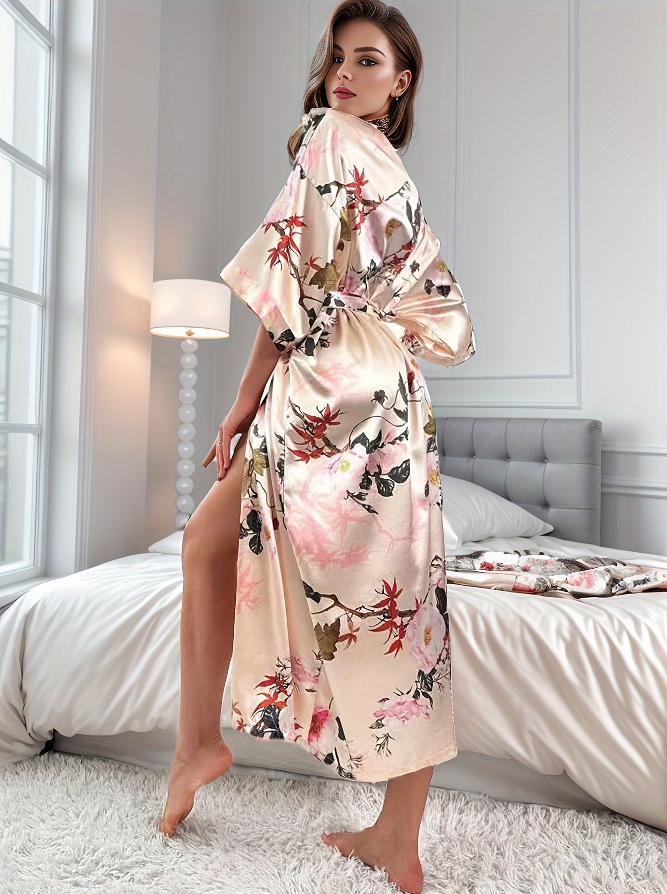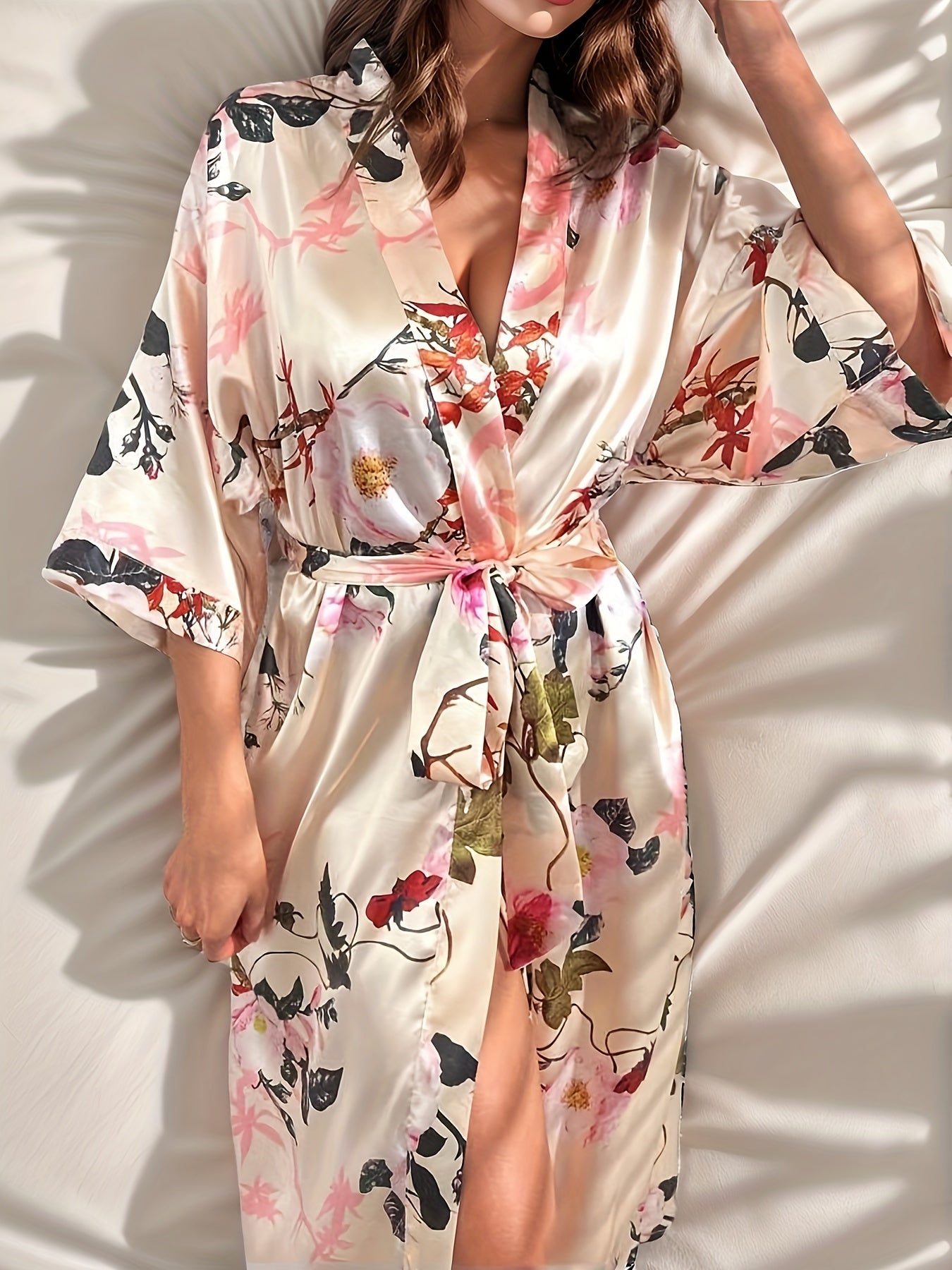 Bata de noche ligera de poliéster para mujer con escote en V profundo y cinturón