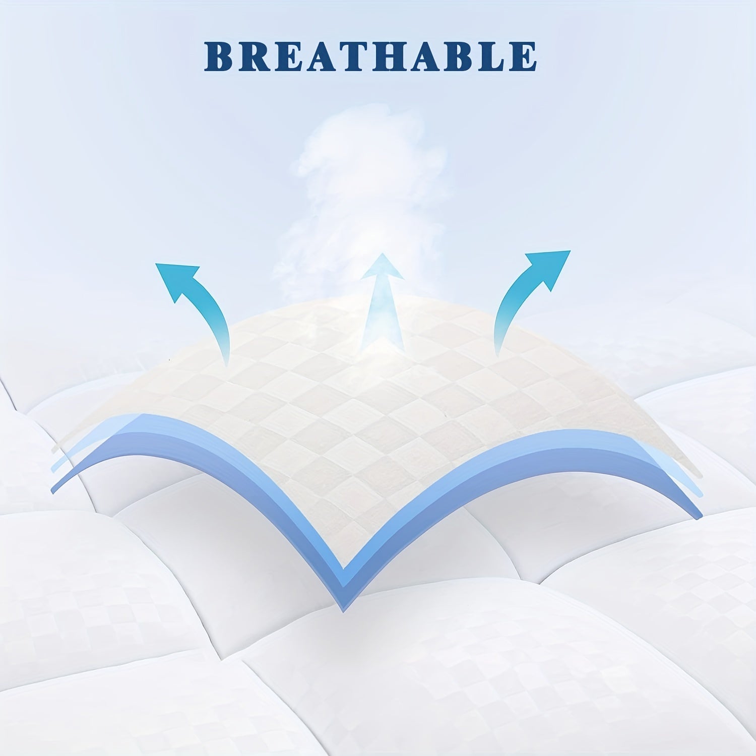 Sensación fresca y duerme bien: El material superior de microfibra enfriadora te proporciona una sensación fresca. La microfibra enfriadora virgen al 50% añadida a los rellenos crea la posibilidad de respirar en la colcha de cama, asegurando una circulación transpirable dentro del colchón. El flujo de aire hace que no te sientas incómodo o demasiado caliente por la noche. El material interior de alta densidad de la colcha puede absorber la humedad y secarse rápidamente, equilibrando realmente la temperatura de tu cuerpo durante toda la noche.